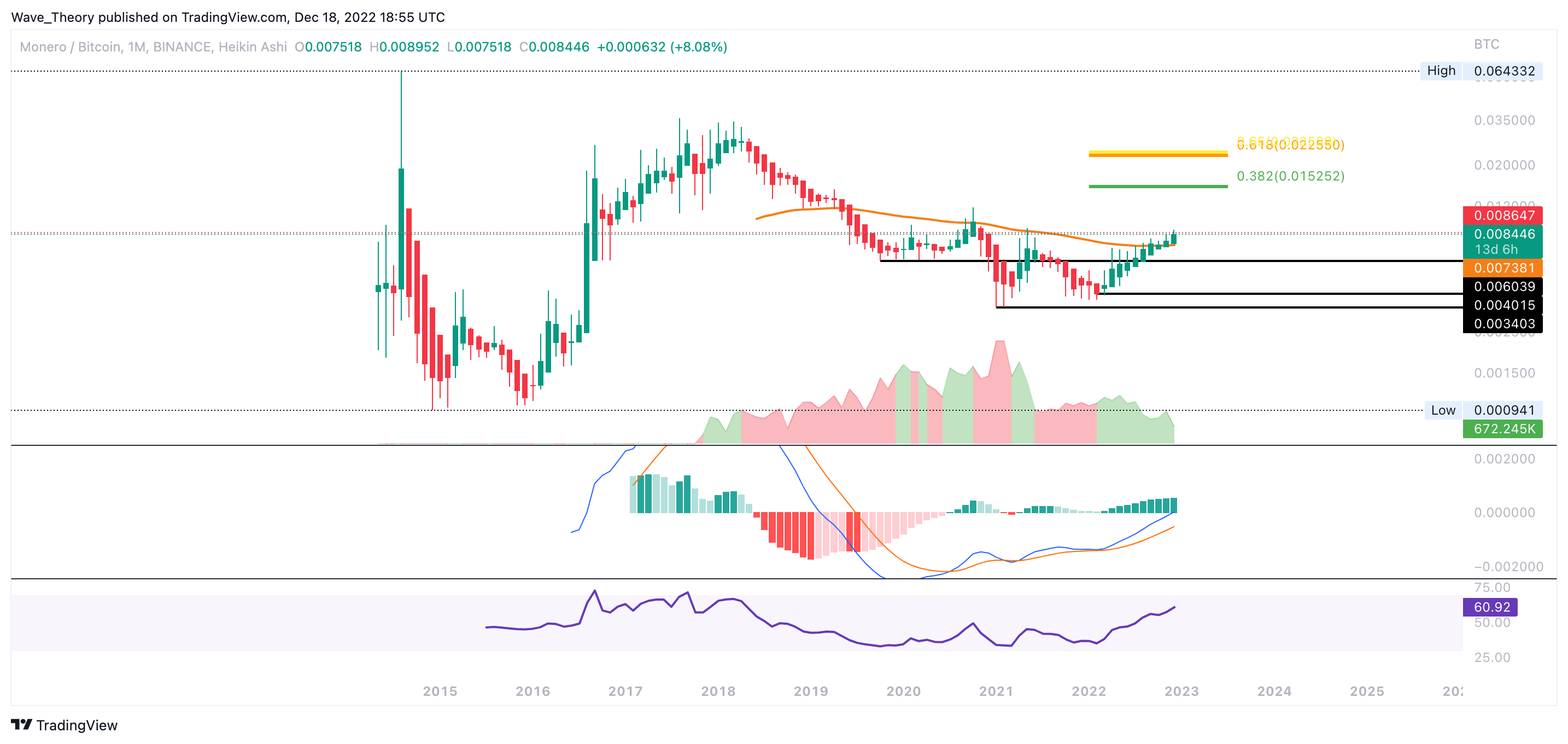 Gegen BTC konnte der Monero Kurs den 50-Monate-EMA Widerstand brechen