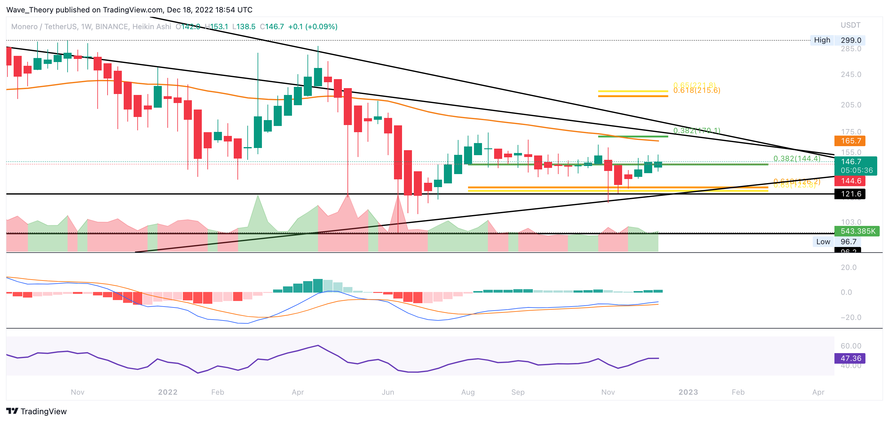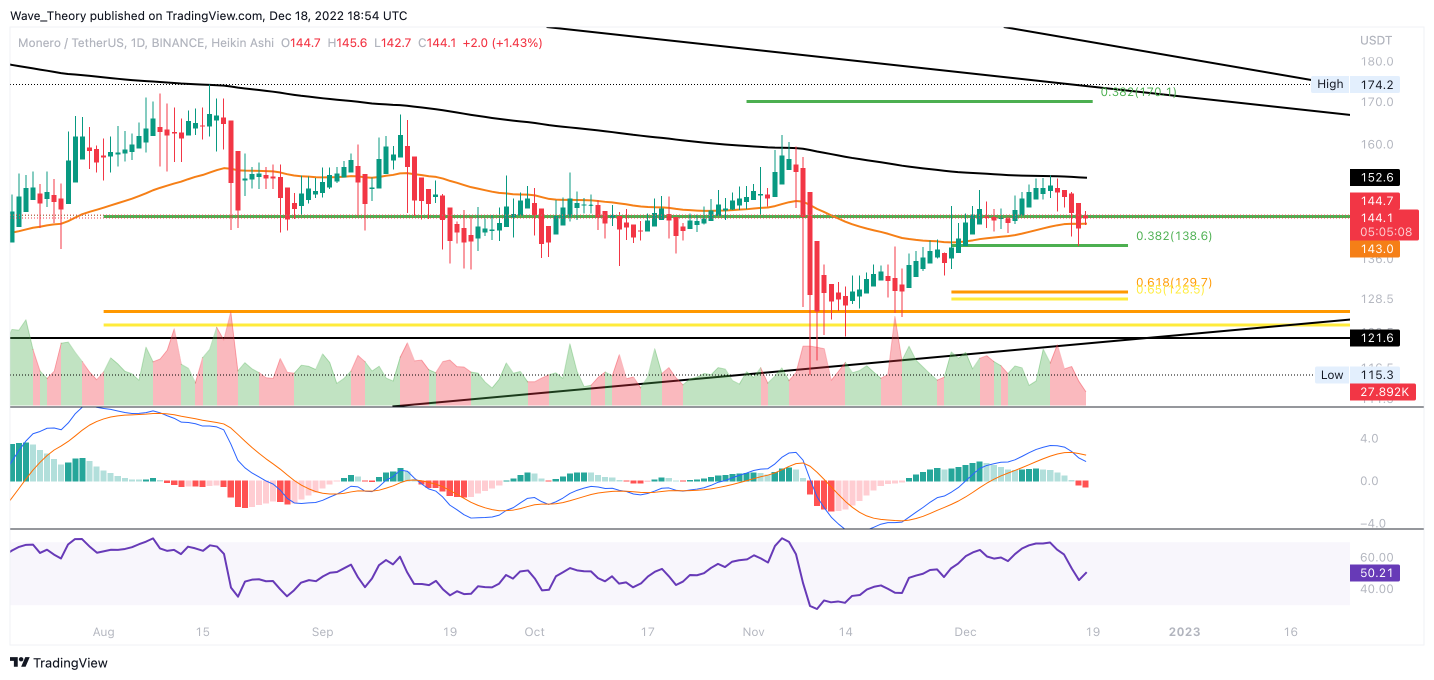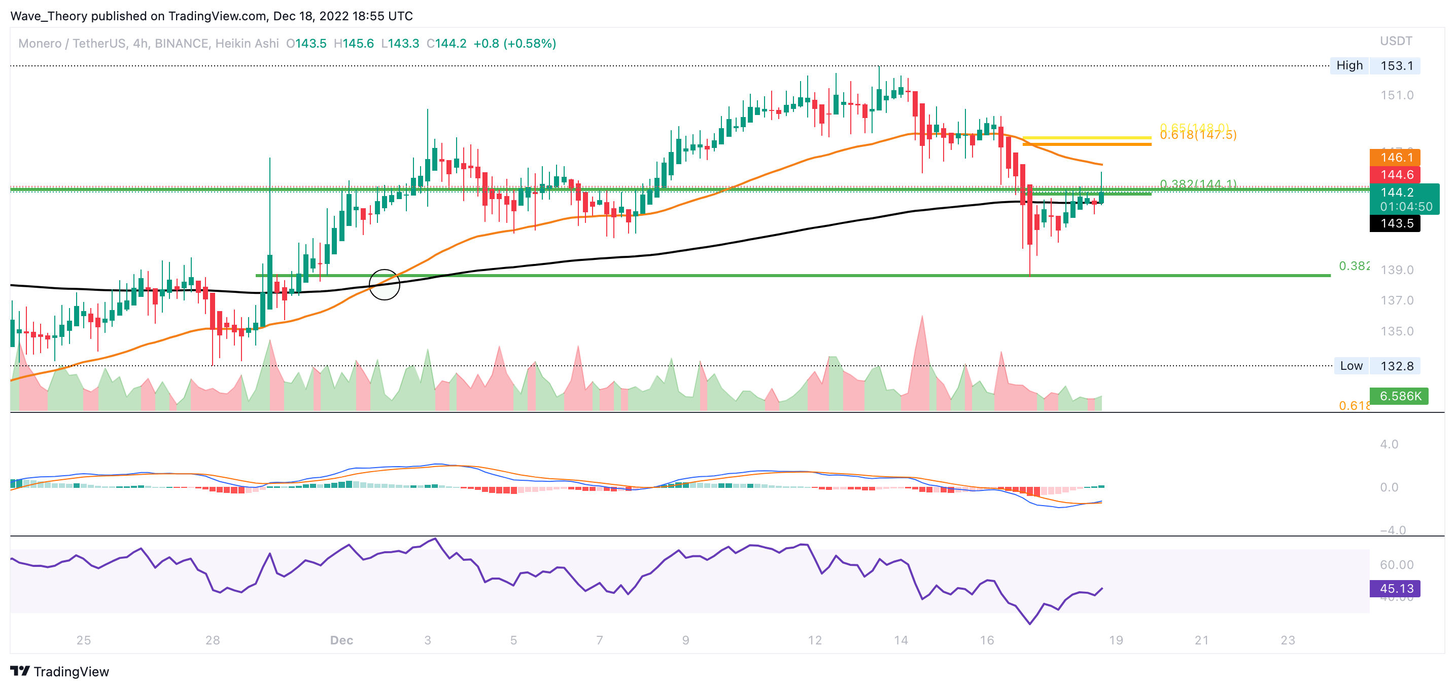 Zudem fiel der XMR Kurs nicht auf ein neues Jahrestief, sondern etablierte einen höheren Tiefpunkt. Denn Monero prallte an der Golden Ratio Unterstützung bei rund 126 USD ab.