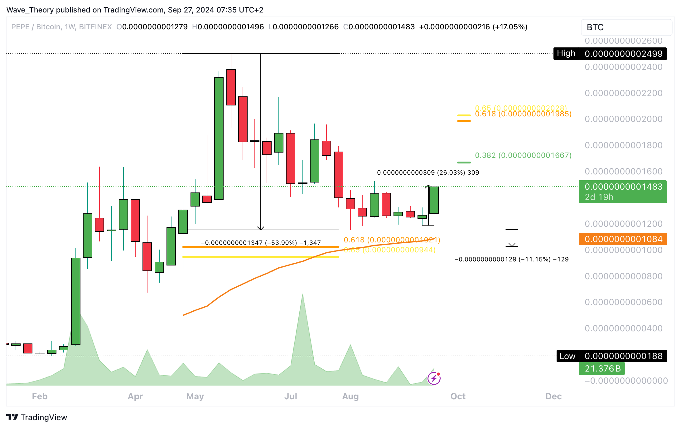 Auch gegen BTC konnte der Kurs stark steigen. So ist Pepe seit letzter Woche rund 26 % gestiegen.