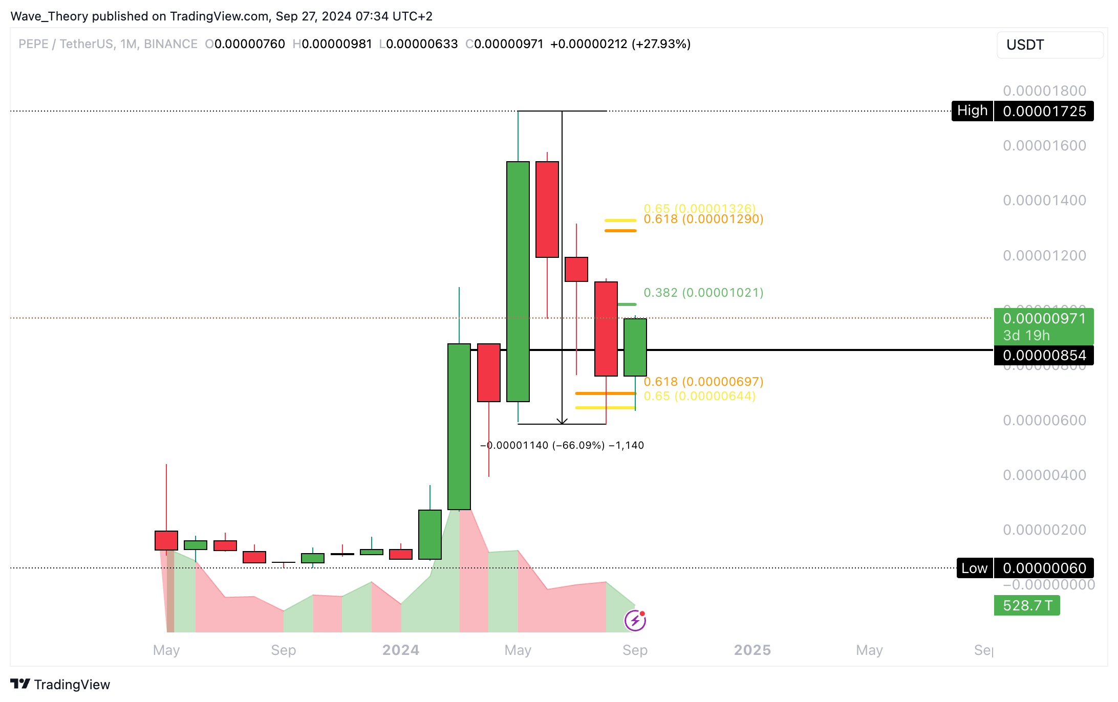 Der Kurs des Memecoins Pepe explodiert derzeit. Wird Pepe jetzt noch höher steigen, um den nächsten Fib Widerstand zu brechen?