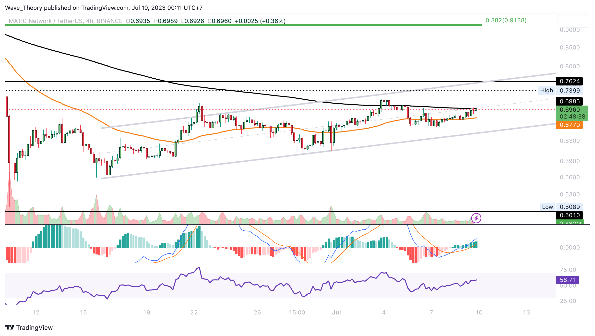 Schließlich tickt das Histogramm des MACDs bereits bullisch höher und die MACD Linien sind bullisch überkreuzt. Darüber hinaus ist der Kurs kurz davor, den 200-4H-EMA Widerstand bei rund 0,7 USD zu brechen.