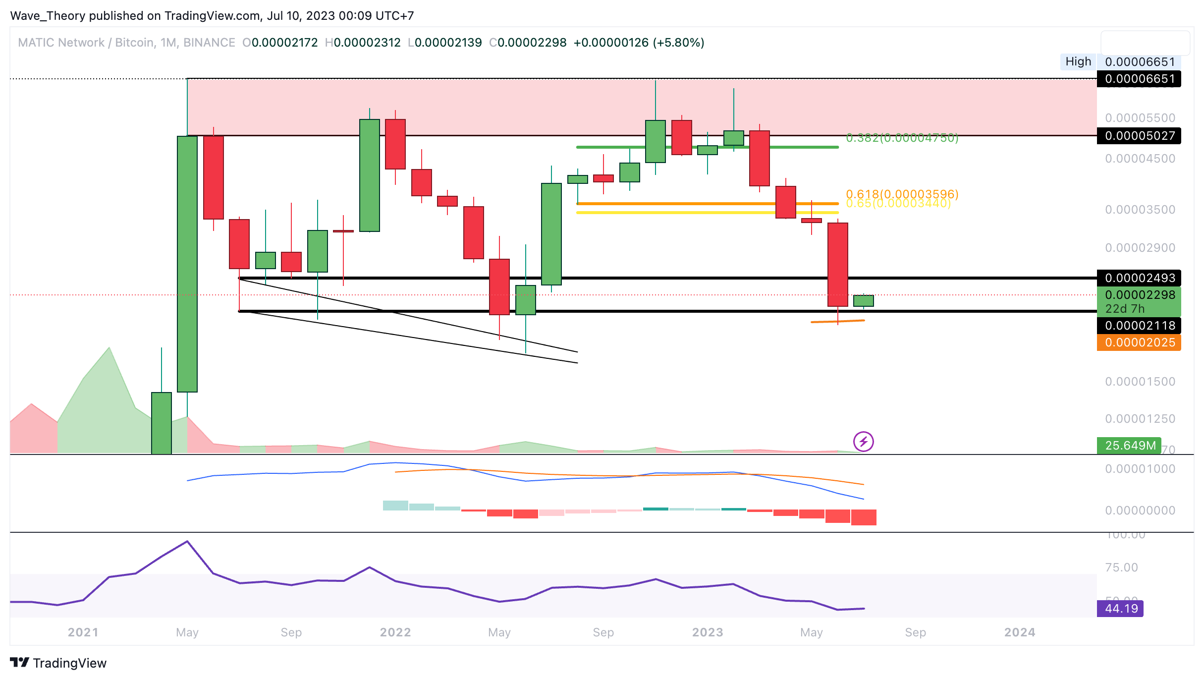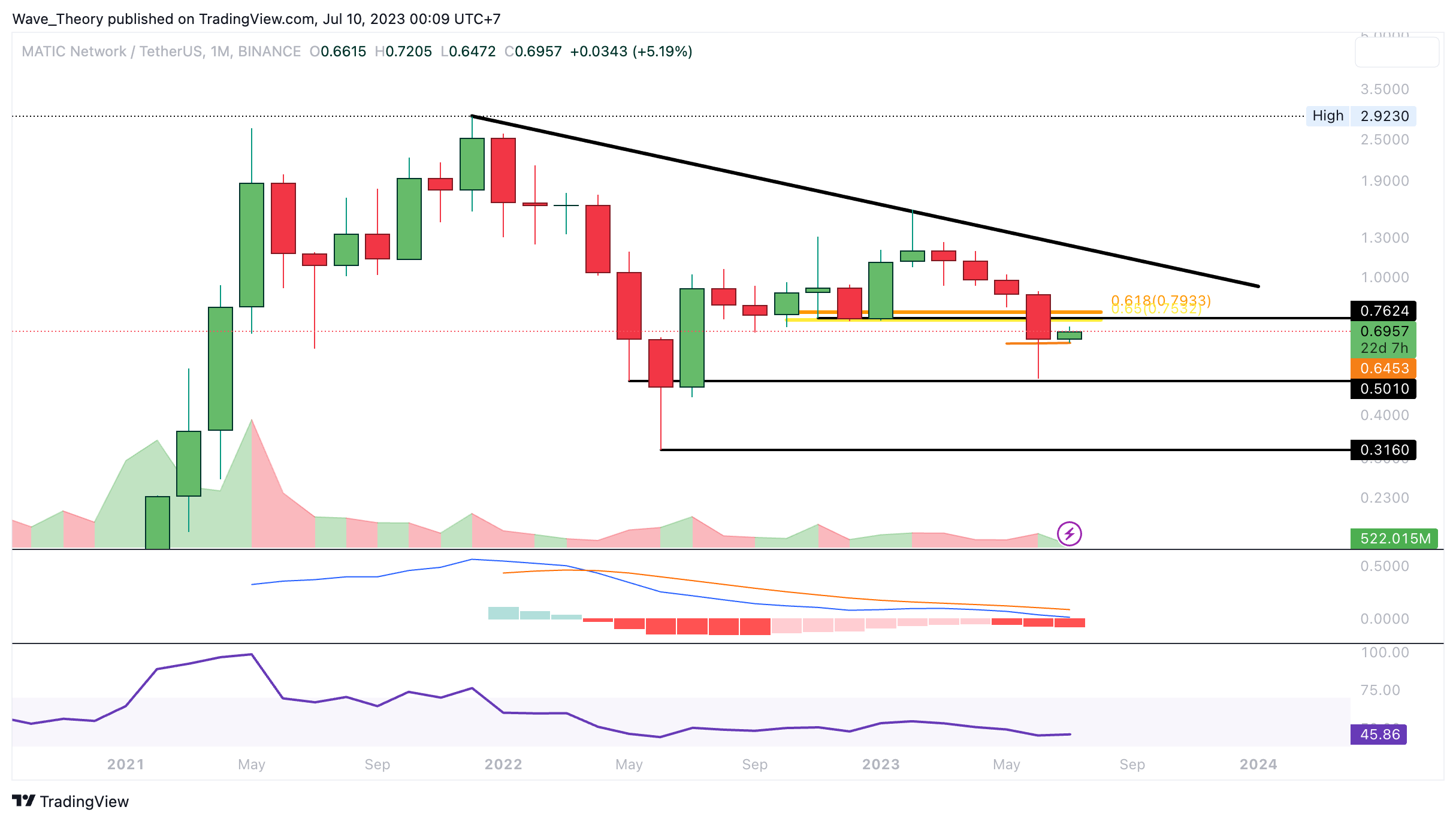 Die Aufwärtsbewegung ist nicht mehr bullisch intakt, denn der Polygon Kurs hat die Golden Ratio Unterstützung bei rund 0,76 USD bärisch gebrochen. Anschließend kehrte der Polygon Kurs annähernd zur horizontalen Unterstützung bei rund 0,5 USD zurück, prallte daran sehr stark ab und konnte noch im selben Monat über dem 50-Monate-EMA bei rund 0,645 USD schließen.