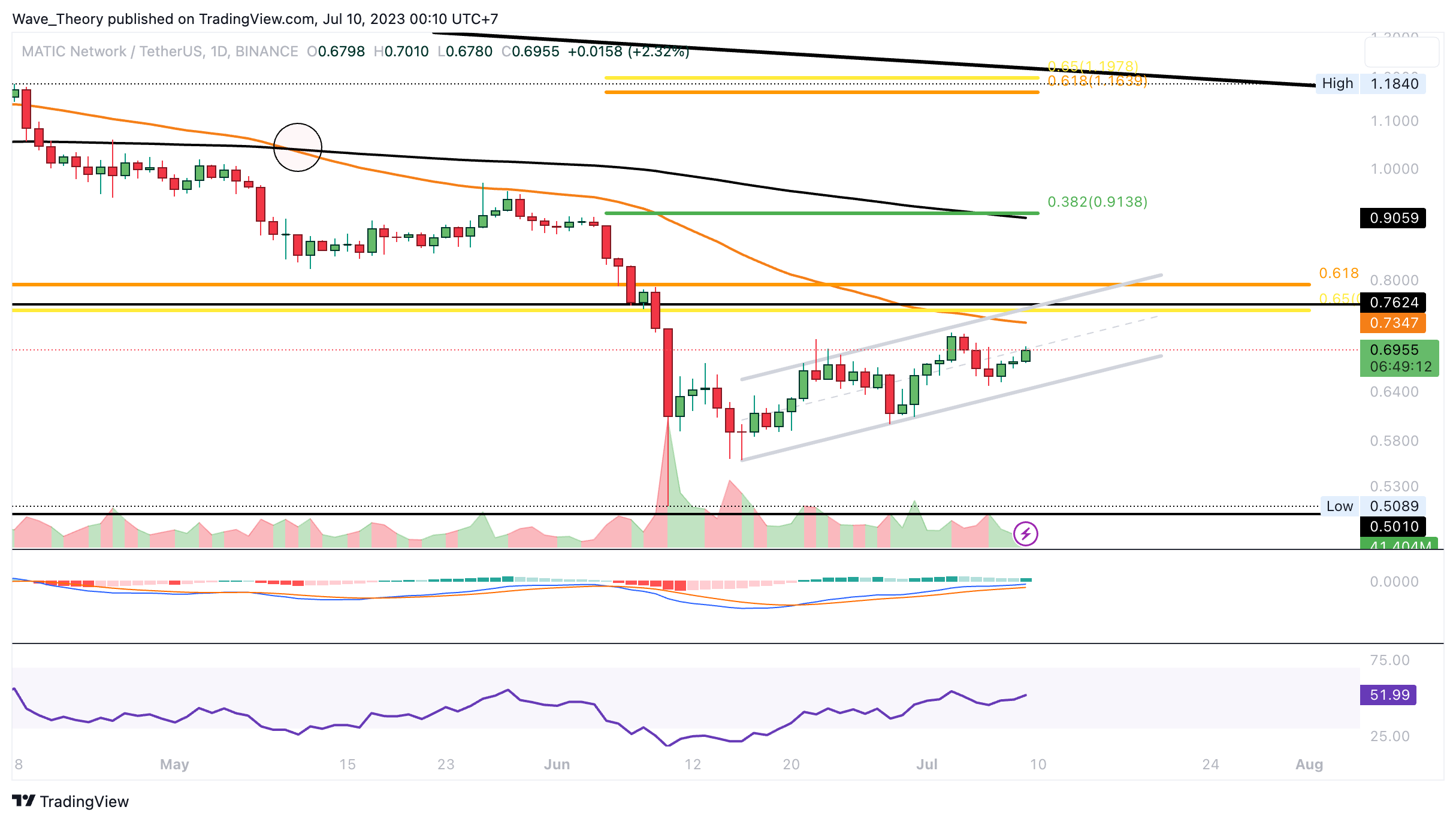 Darüber hinaus befindet sich Polygon aktuell in einem parallelen Aufwärtskanal. Kurz- bis mittelfristig könnte Polygon die Aufwärtsbewegung fortsetzen. Womöglich stößt Polygon aber am nächsten Fib Widerstand auf bärische Ablehnung, um die Abwärtsbewegung fortzusetzen.