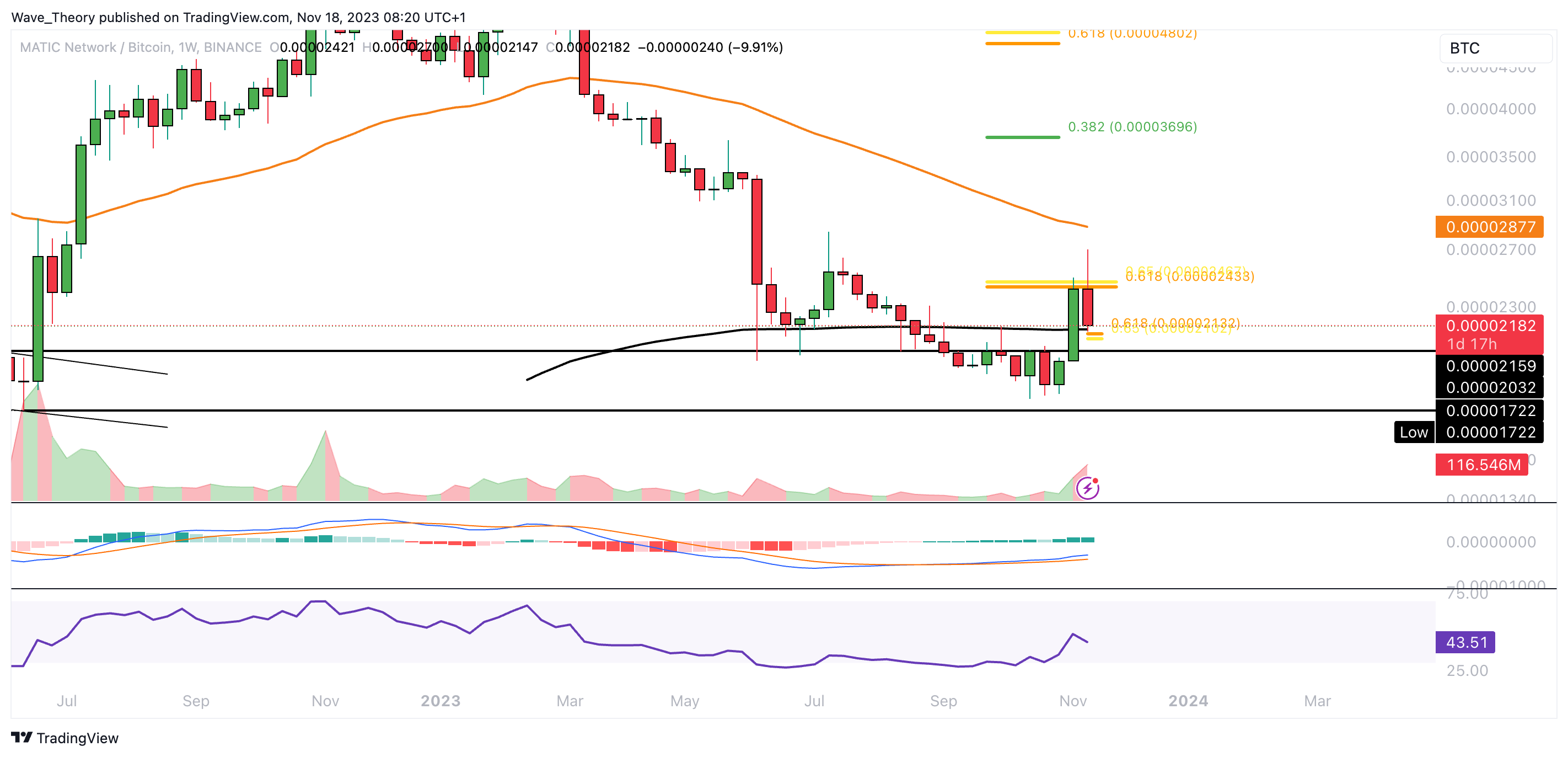 Dort wurde Polygon aber stark bärisch abgewiesen, womit sich der Kurs jetzt an der Golden Ratio Unterstützung bei rund 0,0000213 BTC befindet. Dort fungiert der 200-Wochen-EMA als zusätzliche Unterstützung.