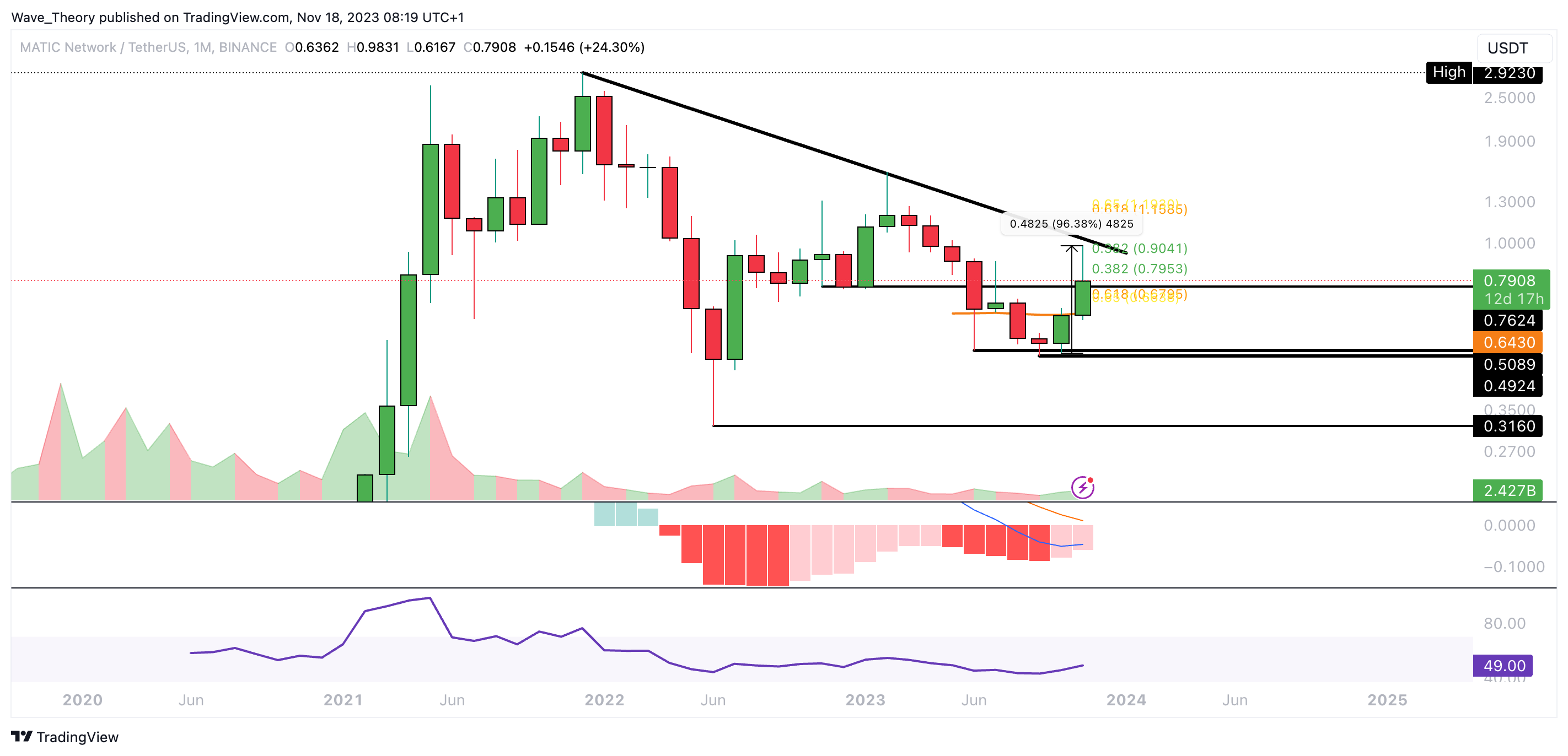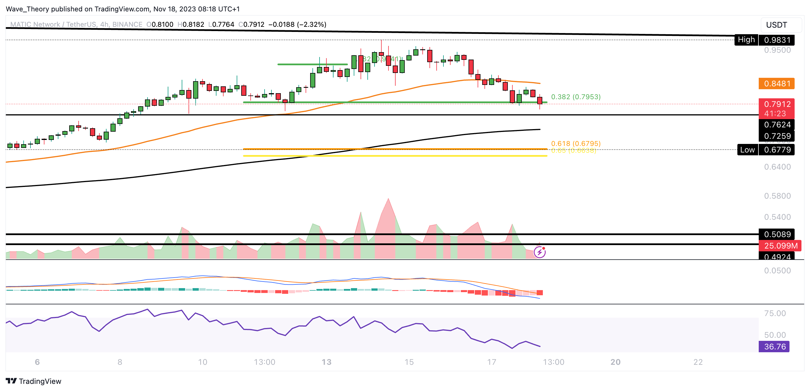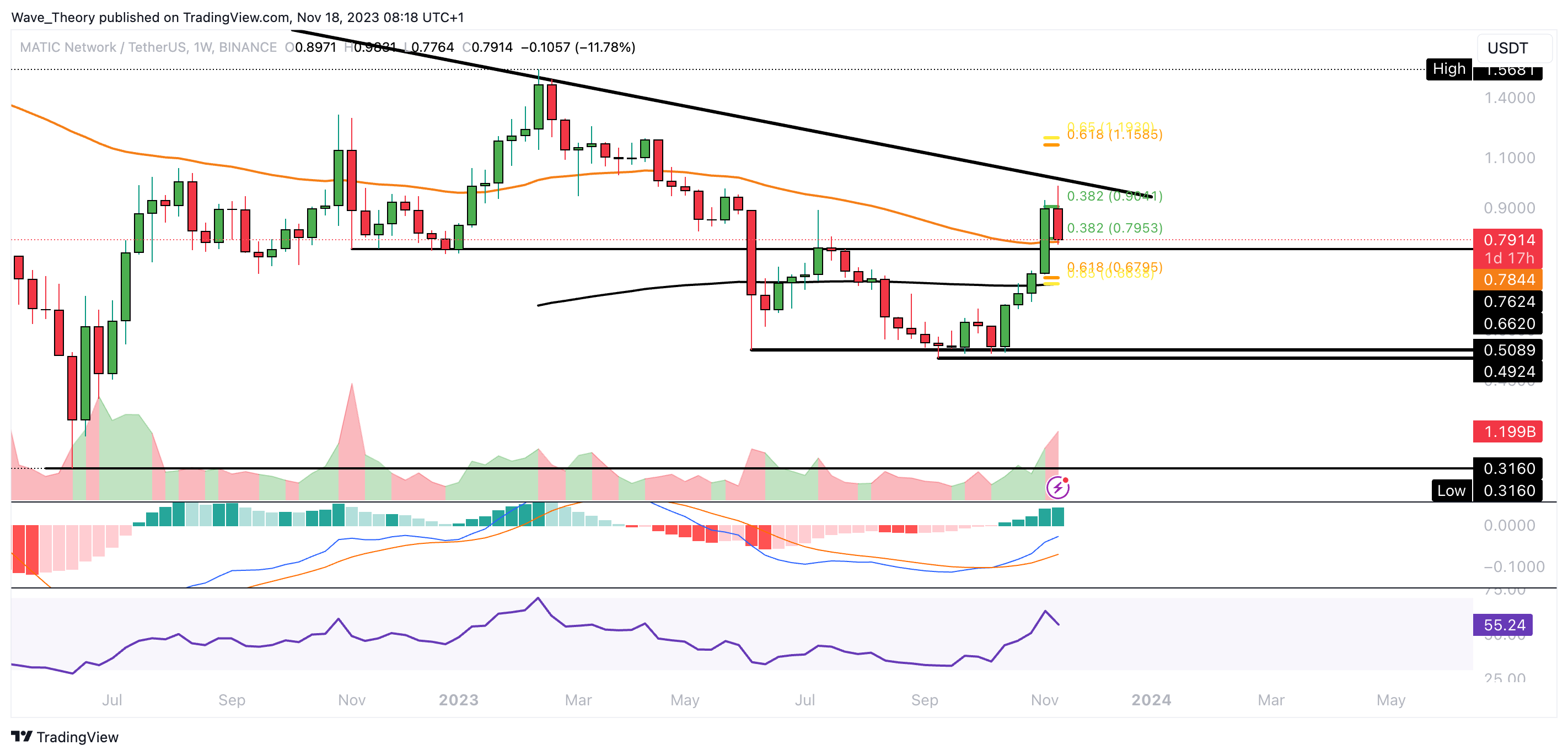 Die MACD Linien sind jedoch noch bärisch überkreuzt und der RSI bewegt sich in neutralem Territorium. Tatsächlich erreichte Polygon den 0,382 Fib Widerstand bei rund 0,9 USD, woran der Kurs in dieser Woche bärisch abgewiesen zu werden scheint.