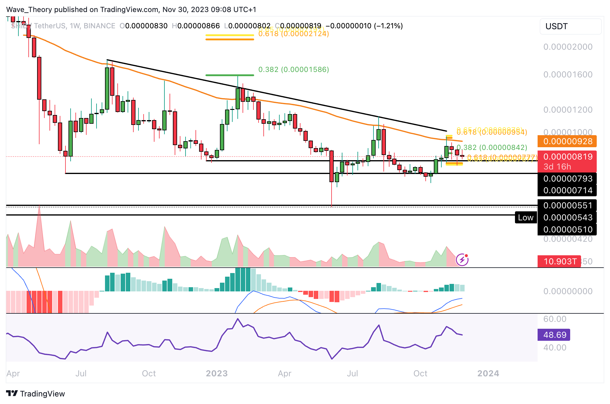 Mit der bärischen Abweisung am Golden Ratio Widerstand bei rund 0,0000095 USD bleibt auch der 50-Wochen-EMA Widerstand unbezwungen. Diesen Widerstand konnte der Shiba Inu seit über einem Jahr nicht überwinden.