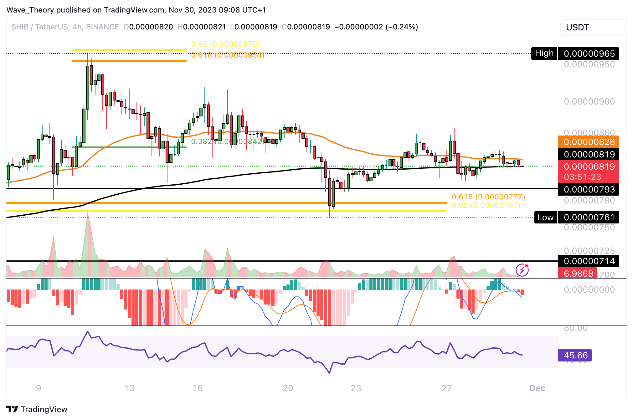 Doch jetzt stößt SHIB am 200-Tage-EMA bei rund 0,00000833 USD auf signifikanten Widerstand. Wenn SHIB daran bärisch abgewiesen wird, könnte der Kurs erneut zur Golden Ratio bei rund 0,0000077 USD korrigieren.