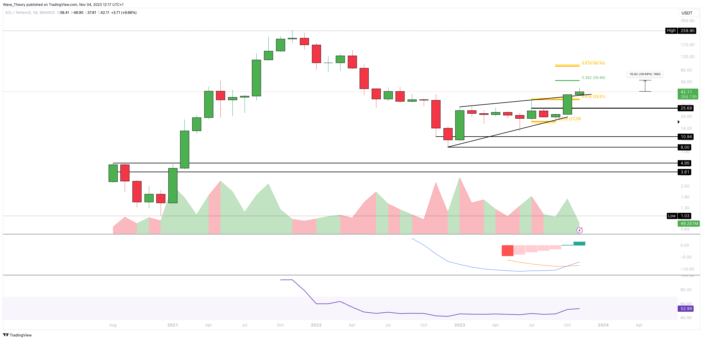 Der SOL Kurs konnte den Golden Ratio Widerstand bei rund 33 USD brechen und damit auch die Trendlinie des bärischen Kursmusters “Rising Wedge” überwinden. Damit könnte der SOL Kurs jetzt den 0,382 Fib Widerstand bei rund 59 USD anvisieren.