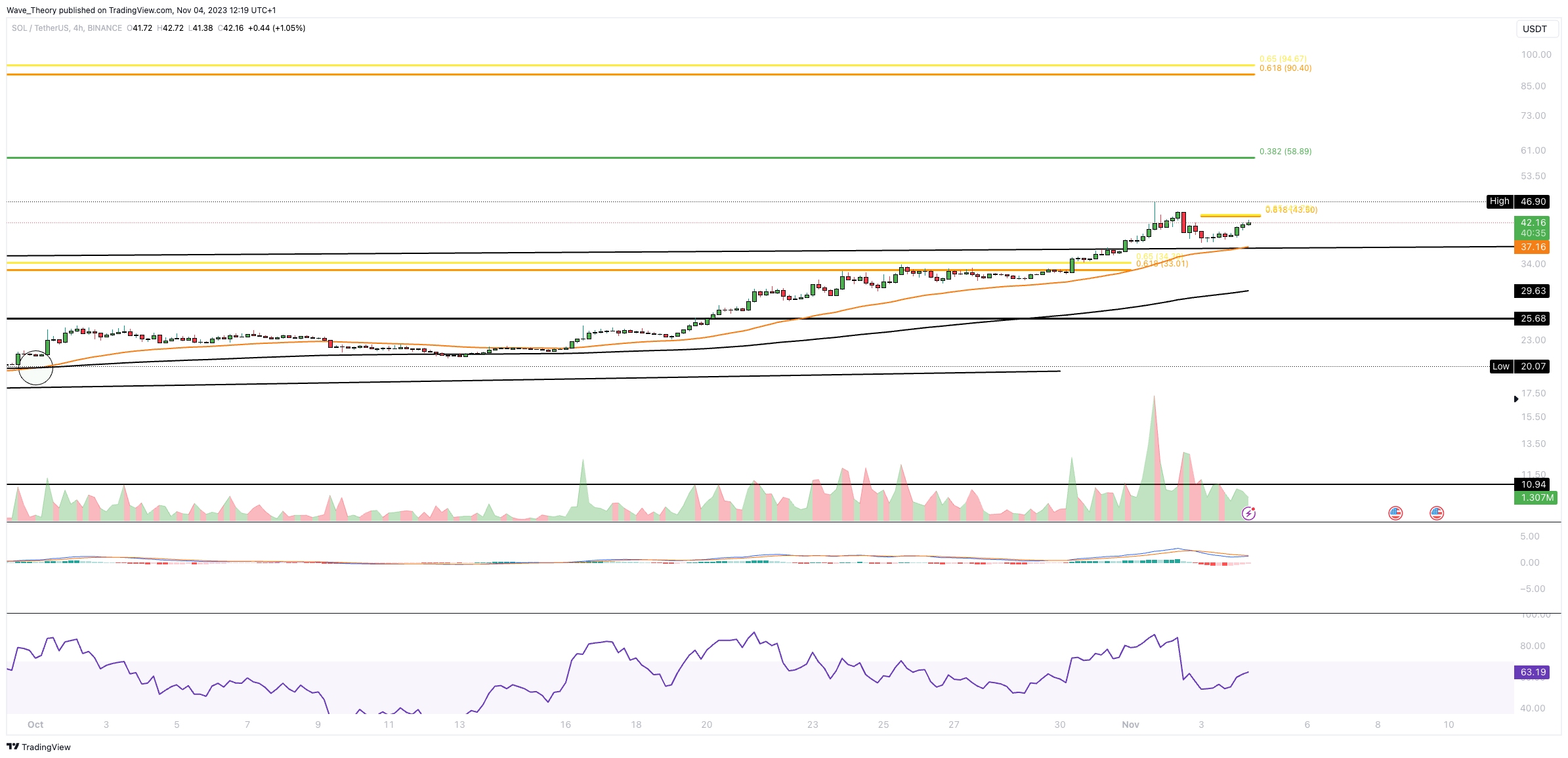 Der nächste Widerstand liegt damit bei rund 44 USD. Wenn Solana den Golden Ratio Widerstand bei rund 44 USD bricht, steht einem Anstieg zum 0,382 Fib Niveau bei rund 59 USD nichts mehr im Weg.