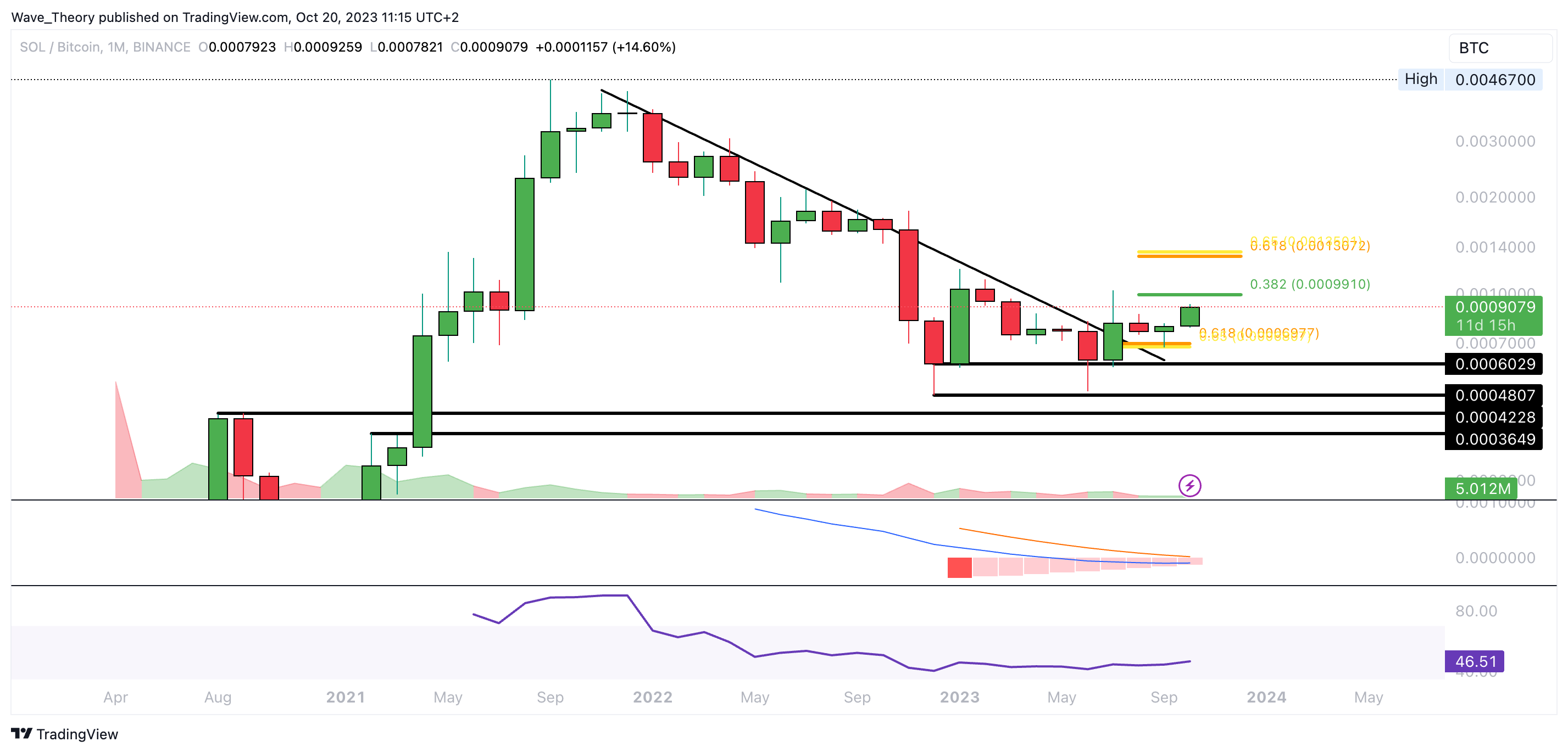 Gegen Bitcoin befindet sich der Solana Kurs auf dem Weg zum 0,382 Fib Widerstand bei rund 0,00099 BTC