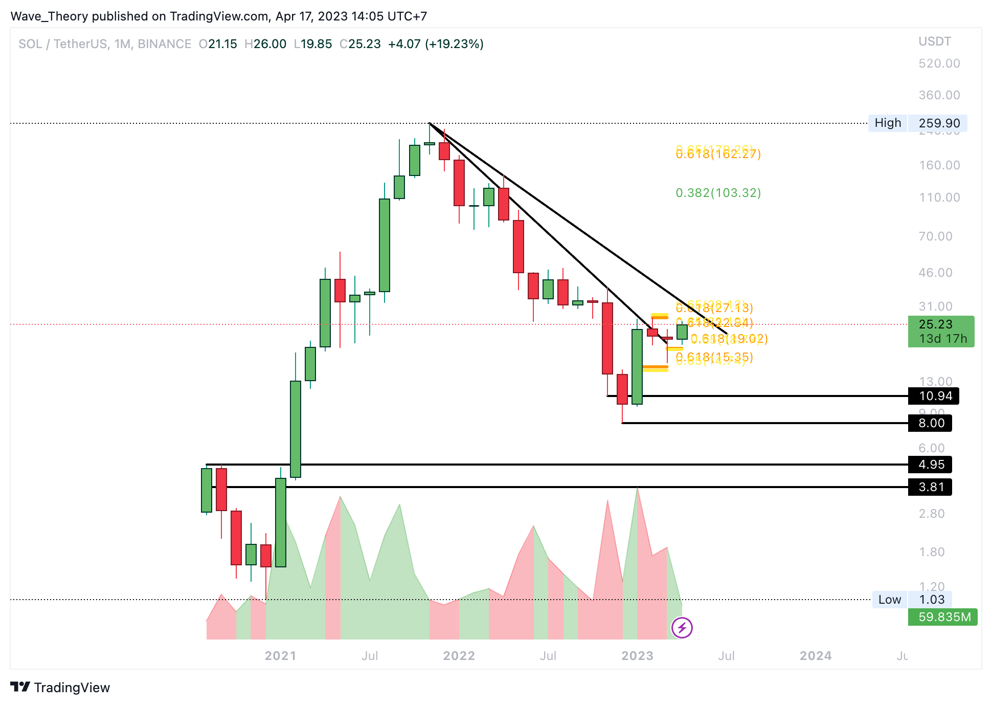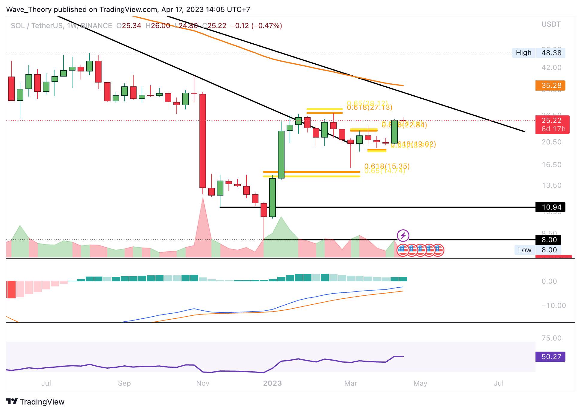 Wenn Solana die bärische Trendlinie des gesamten Abwärtstrends am 50-Wochen-EMA bei rund 35 USD bricht, könnte Solana einen gewaltigen Aufwärtstrend initiieren. Dann könnte Solana bis zum 0,382 Fib Niveau bei rund 103,3 USD oder gar bis zur Golden Ratio bei rund 170 USD steigen.