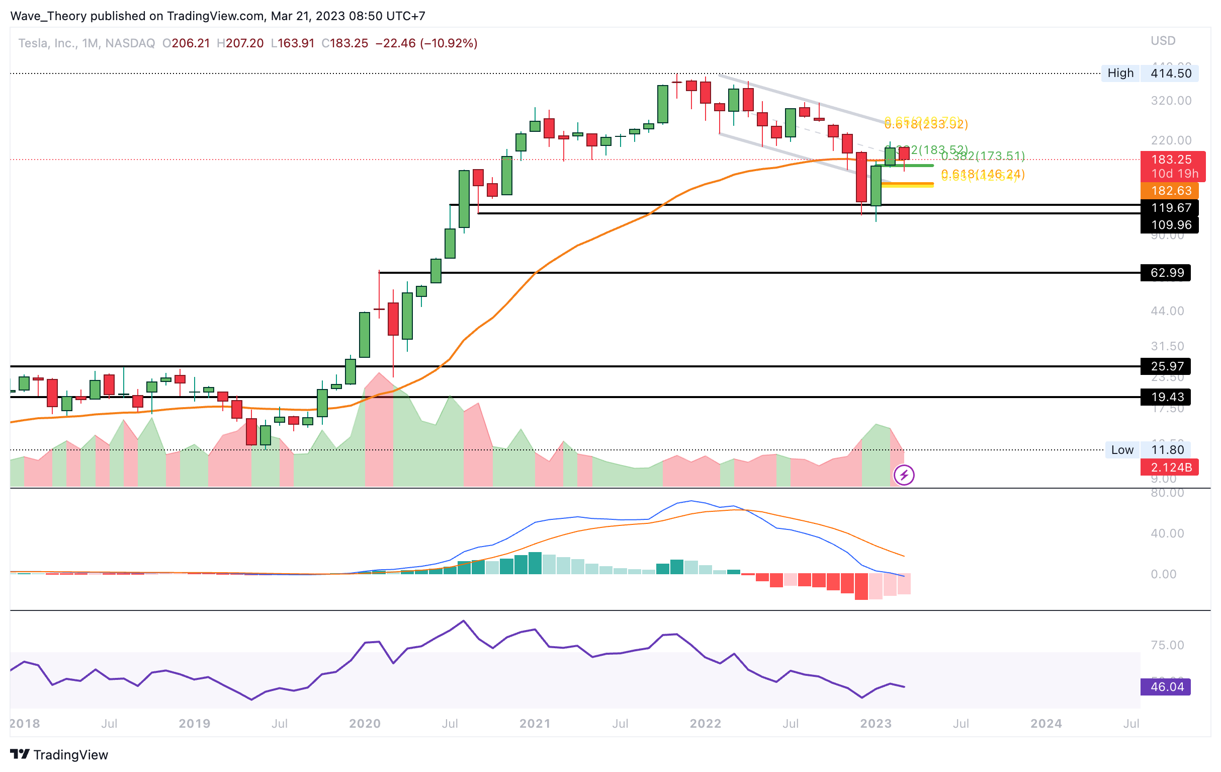 - Tesla befindet sich jetzt am 50-Monate-EMA bei rund 182 USD