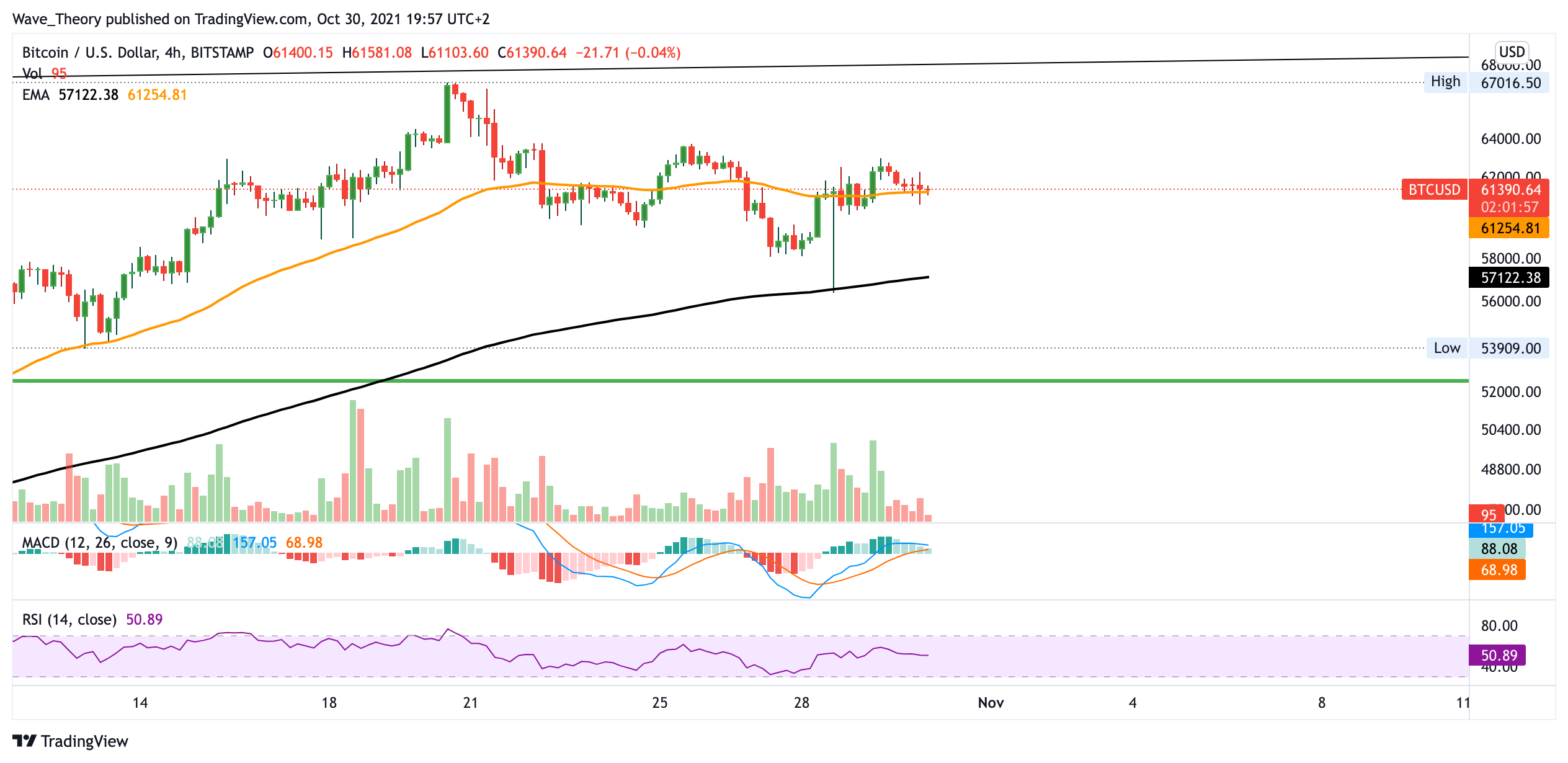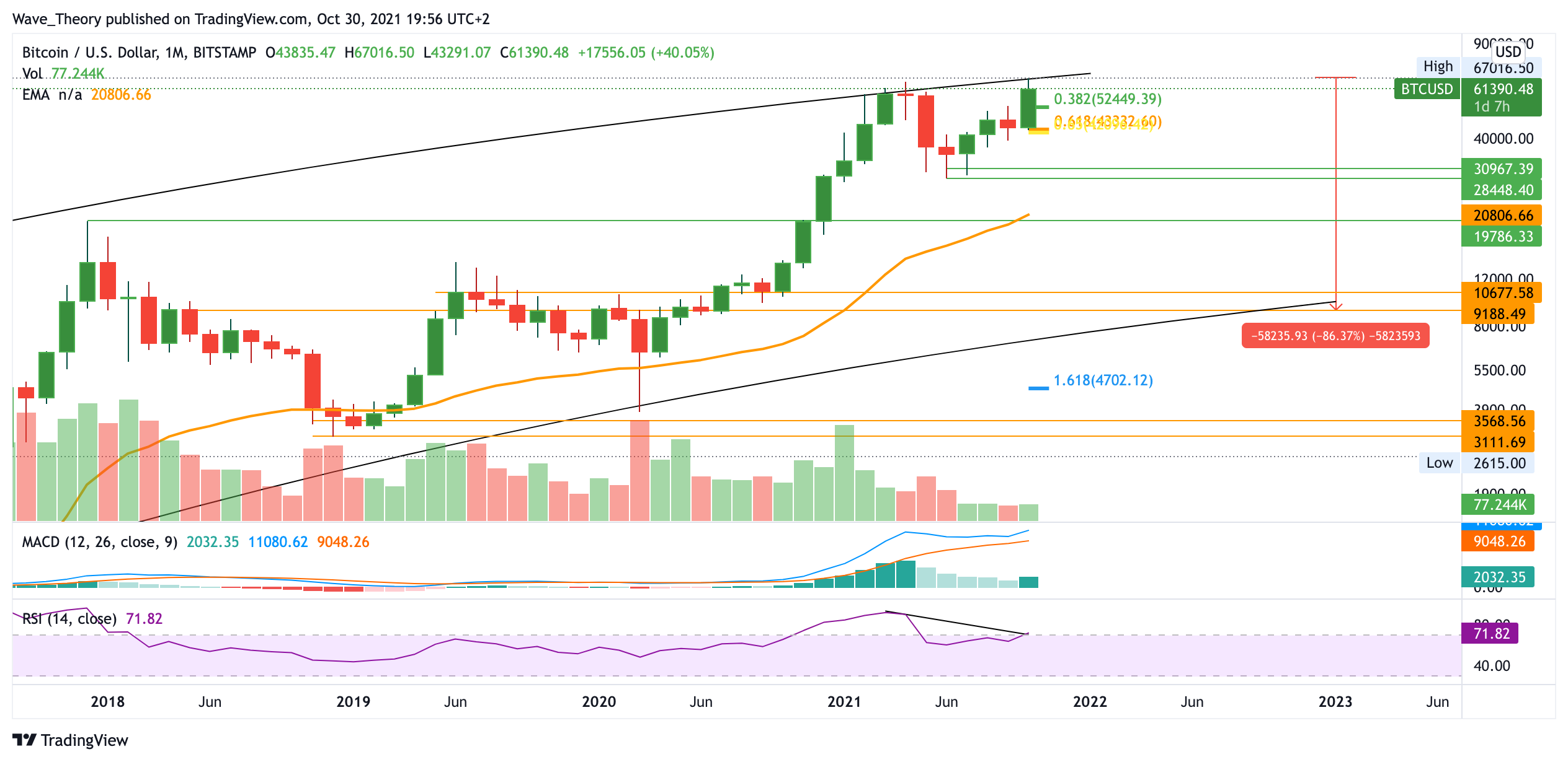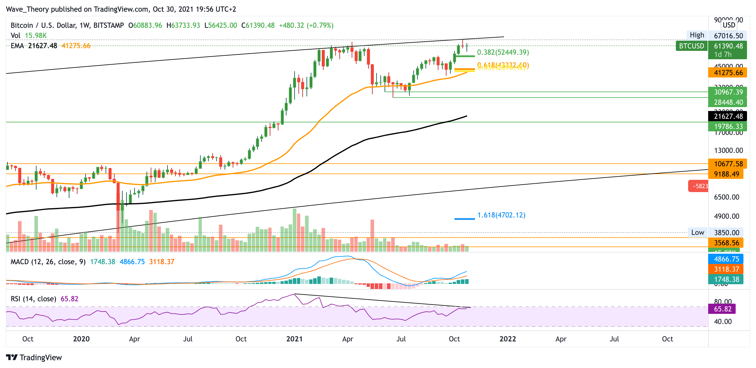Der Oktober hätte nicht bullischer verlaufen können für den BTC Kurs. Rund 55 % stieg der BTC Kurs in diesem Monat. Jedoch bahnt sich damit auch eine massive bärische Divergenz im RSI an. Angenommen der Bitcoin Kurs erreicht kein neues Allzeithoch mehr dieses Jahr, so könnte er sich im Zuge eines Abwärtstrends an rund 20.000 USD historische Unterstützung finden. Angesichts des MACDs entwickelt sich der Bitcoin Kurs aber noch immer bullisch. Aktuell ist nicht davon auszugehen, dass der Bitcoin Kurs unter 52.000 USD respektive 43.000 USD fällt. An diesen Preisniveaus könnte der BTC Preis sehr stark abprallen.