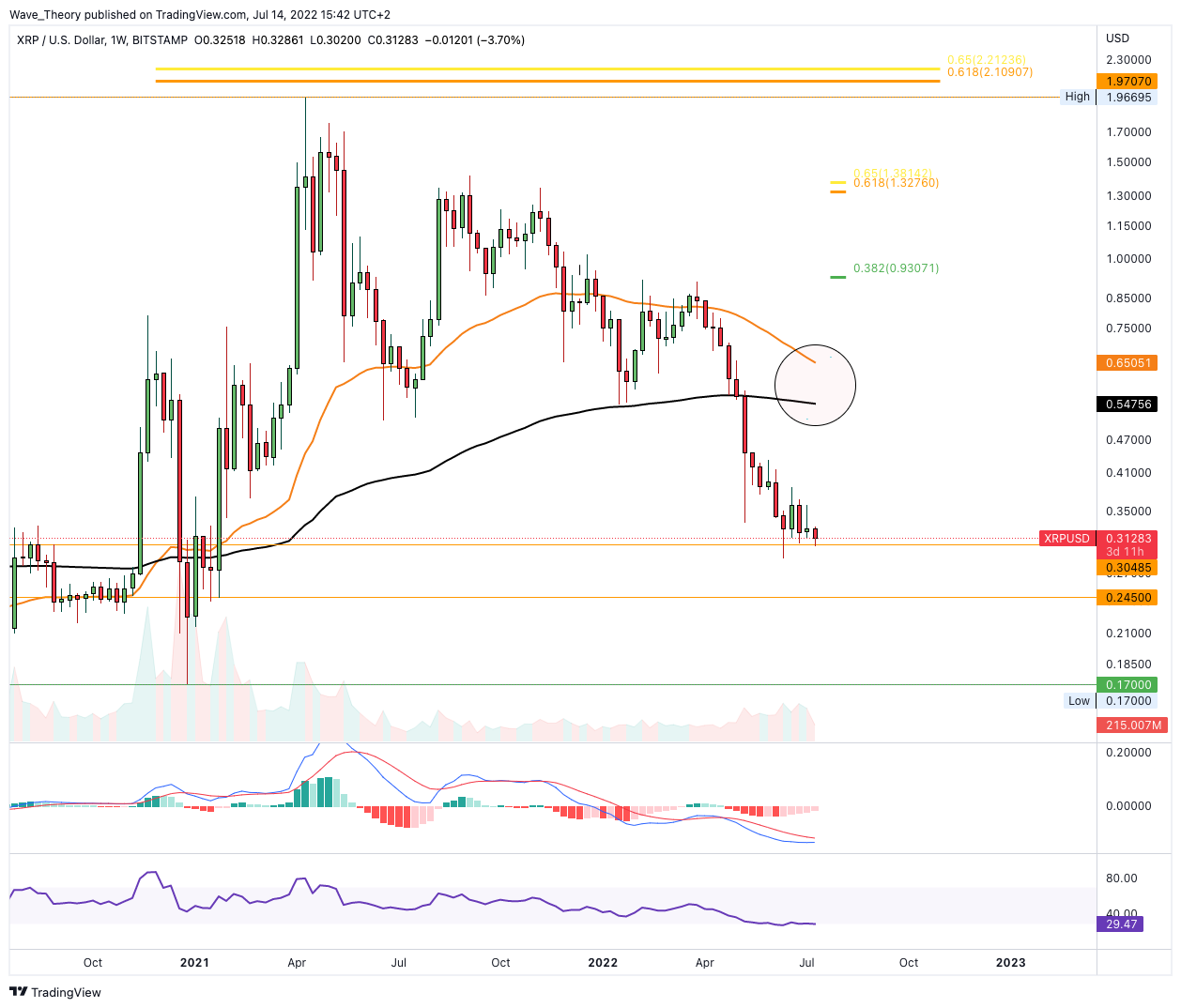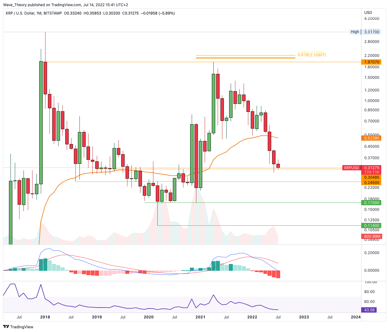 Der Trend von Ripple ist seit 2018 bärisch, denn selbst im Bullenlauf zwischen 2020 und 2021 konnte XRP die Golden Ratio bei rund 2,1 USD nicht überwinden. Damit blieb das ATH bei rund 3,3 USD ohnehin unerreicht. Zudem zeigt sich der MACD im Monatschart eindeutig bärisch, denn das Histogramm tickt bärisch tiefer und die MACD Linien sind bärisch überkreuzt. Der RSI nähert sich dabei überverkauften Regionen, gibt aber weder bullische noch bärische Signale.