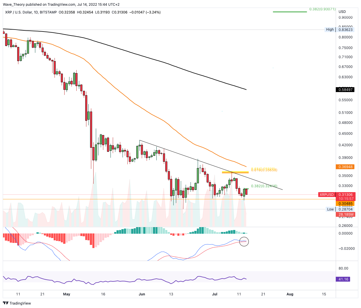 Am Ende der letzten Aufwärtsbewegung zum Monatswechsel zwischen Juni und Juli wurde der XRP Kurs stark an der Golden Ratio bei rund 0,36 BTC bärisch abgewiesen, woraufhin Ripple erneut zur Unterstützung bei rund 0,3 USD zurückkehrte. Dort angekommen, prallte XRP stark ab und stieg bis 0,324 USD, wo der Ripple Kurs auf starke Ablehnung am 0,382 Fib Niveau stieß.