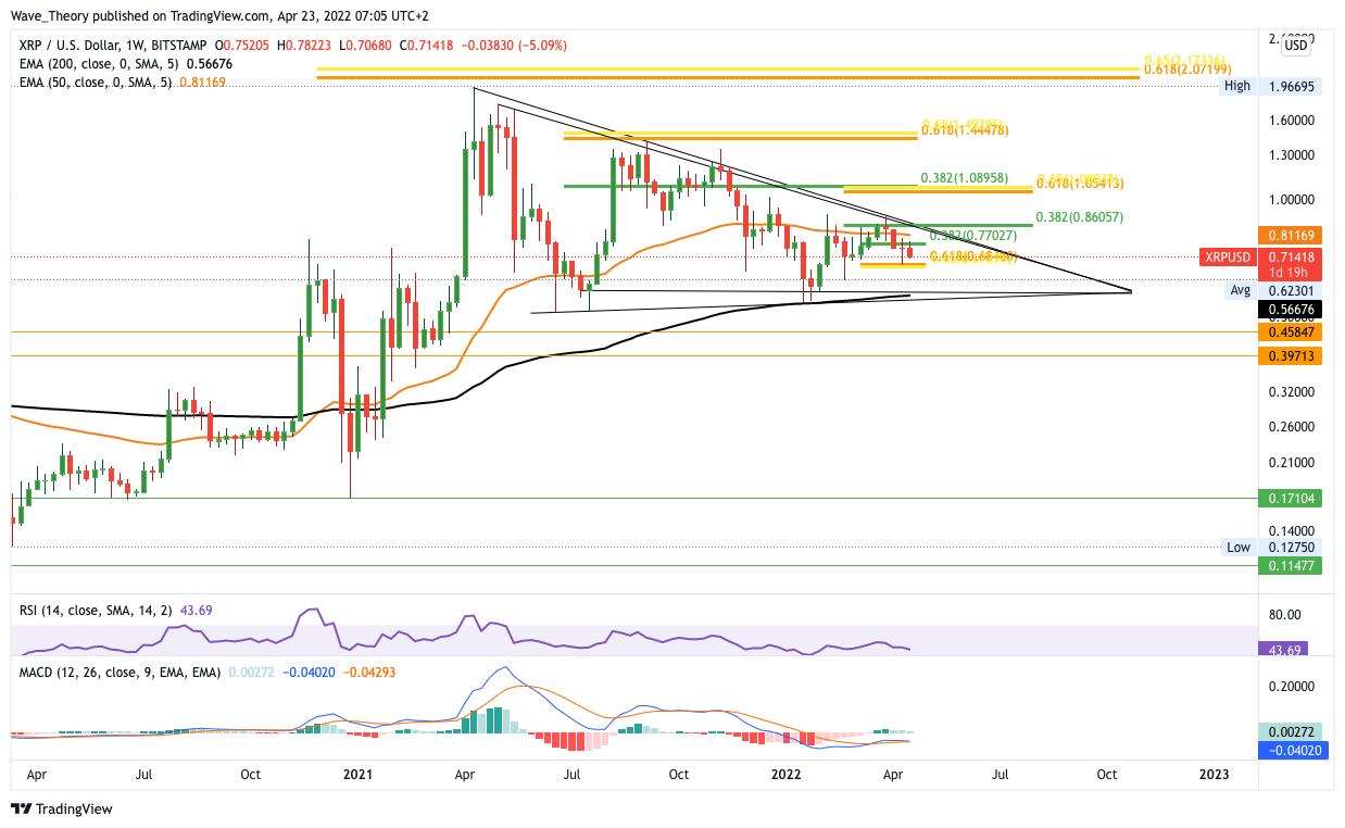 Sollte XRP nicht an der Golden Ratio Unterstützung bei 0,68 USD erfolgreich abprallen, wird er womöglich zum 200-Wochen-EMA bei 0,566 USD zurückkehren. Dort befindet sich zudem die Trendlinie des absteigenden Dreiecks, durch welches ein bärischer Ausbruch erfolgen könnte, sofern XRP am 200-Wochen-EMA nicht abprallt. Jedoch ist das vorliegende absteigende Dreieck kein sauberes Kursmuster, denn XRP formte zwar eine Serie an tieferen Hochpunkte, jedoch konnte der XRP Kurs ebenso einen leicht höheren Tiefpunkt etablieren. Dabei konnte Ripple am 200-Wochen-EMA abprallen, was XRP vor einem bärischen Ausbruch bewahren könnte, sofern XRP erneut daran abprallt.