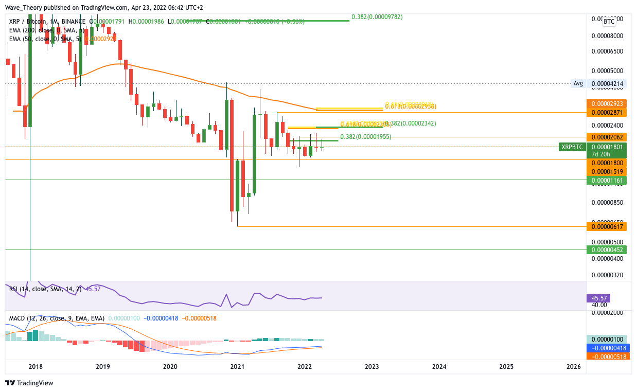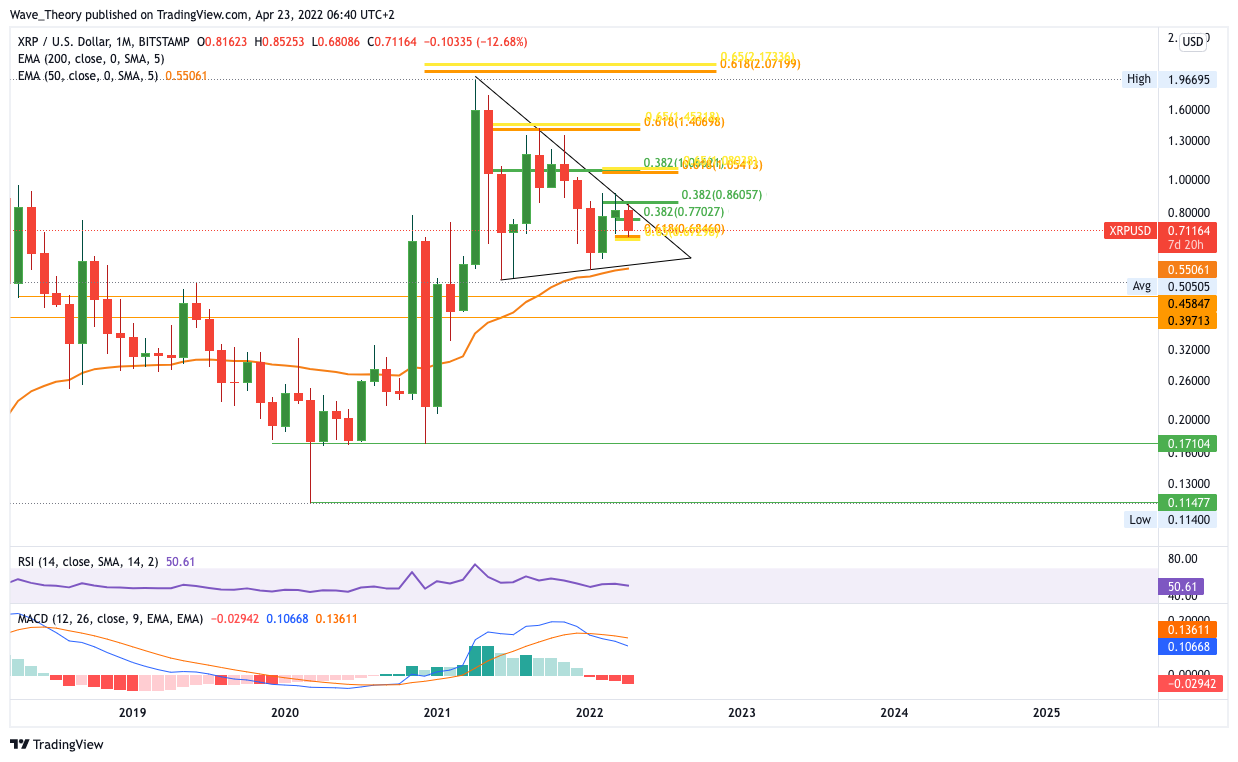 Bricht der Ripple Kurs bärisch aus und damit unter die 50-Monate-EMA bei 0,55 USD, so findet XRP erst wieder zwischen 0,4 – 0,46 USD Unterstützung. Sollte der Ripple Kurs auch diese Unterstützung bärisch durchdringen, könnte XRP sogar bis 0,11 – 0,17 USD fallen.