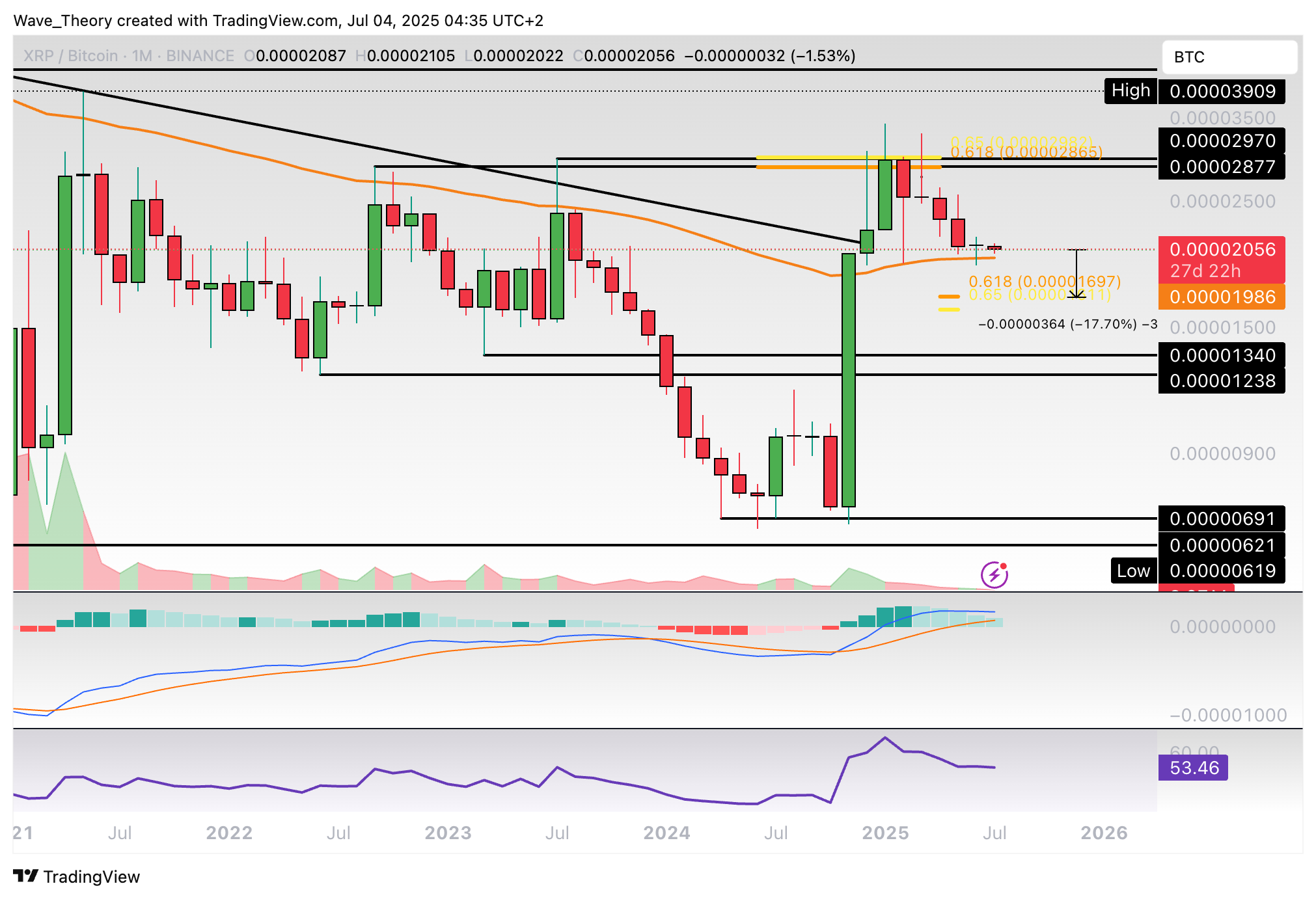 Gegen Bitcoin stößt der XRP Kurs am 50-Monate-EMA auf Unterstützung