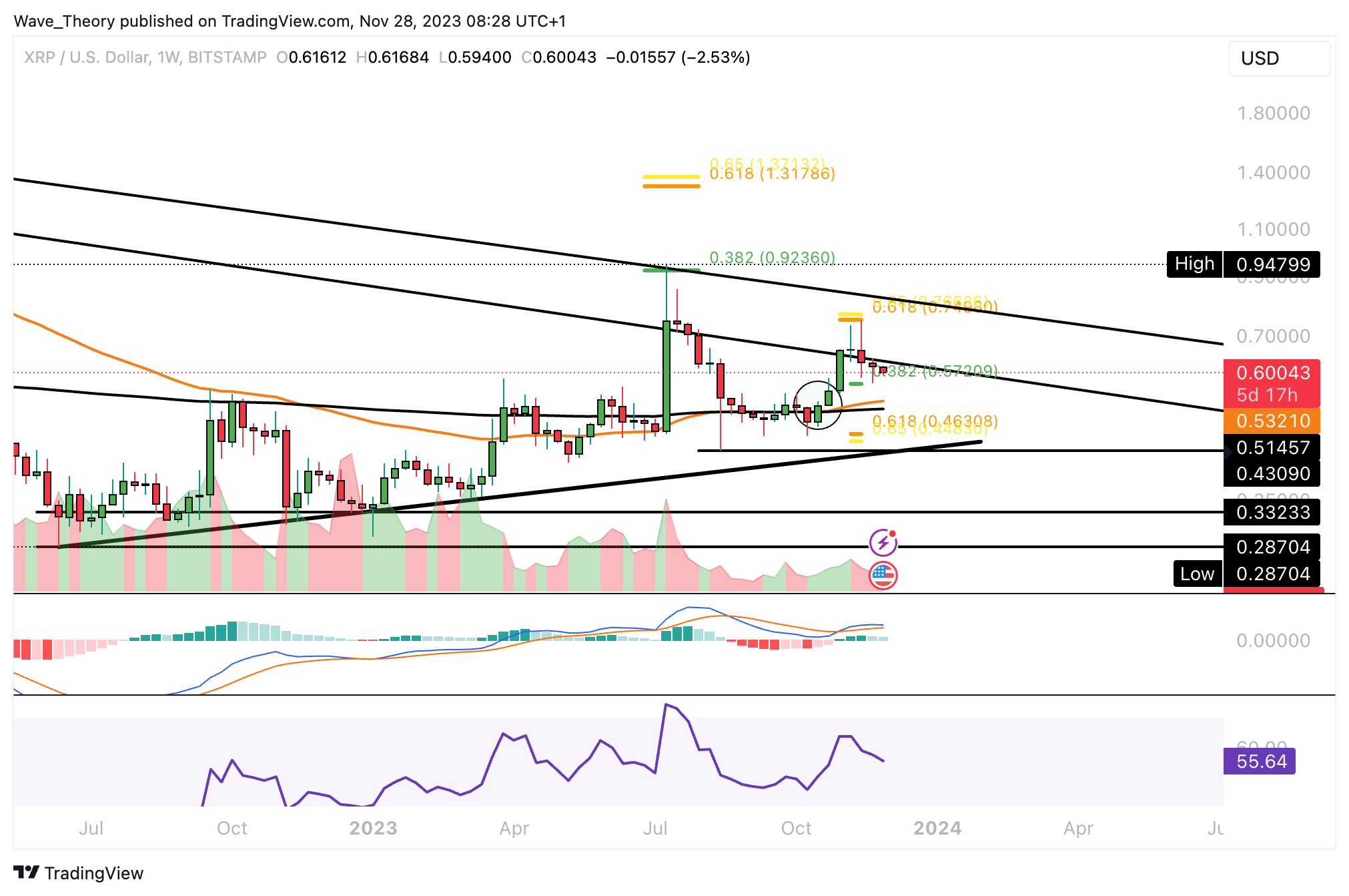 Der XRP Kurs konnte vor wenigen Tagen an der 0,382 Fib Unterstützung bei rund 0,572 USD abprallen