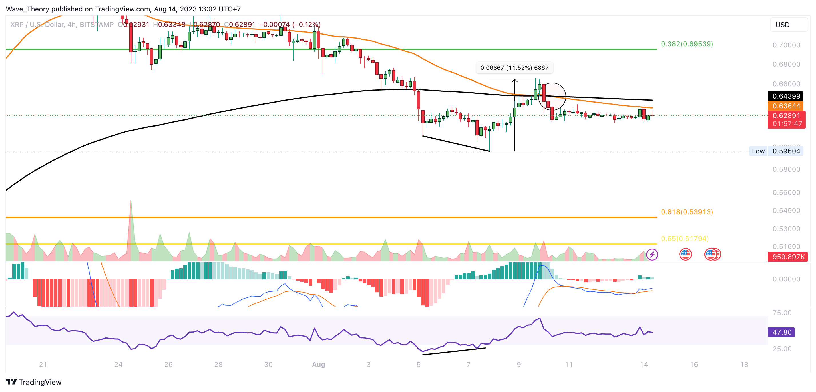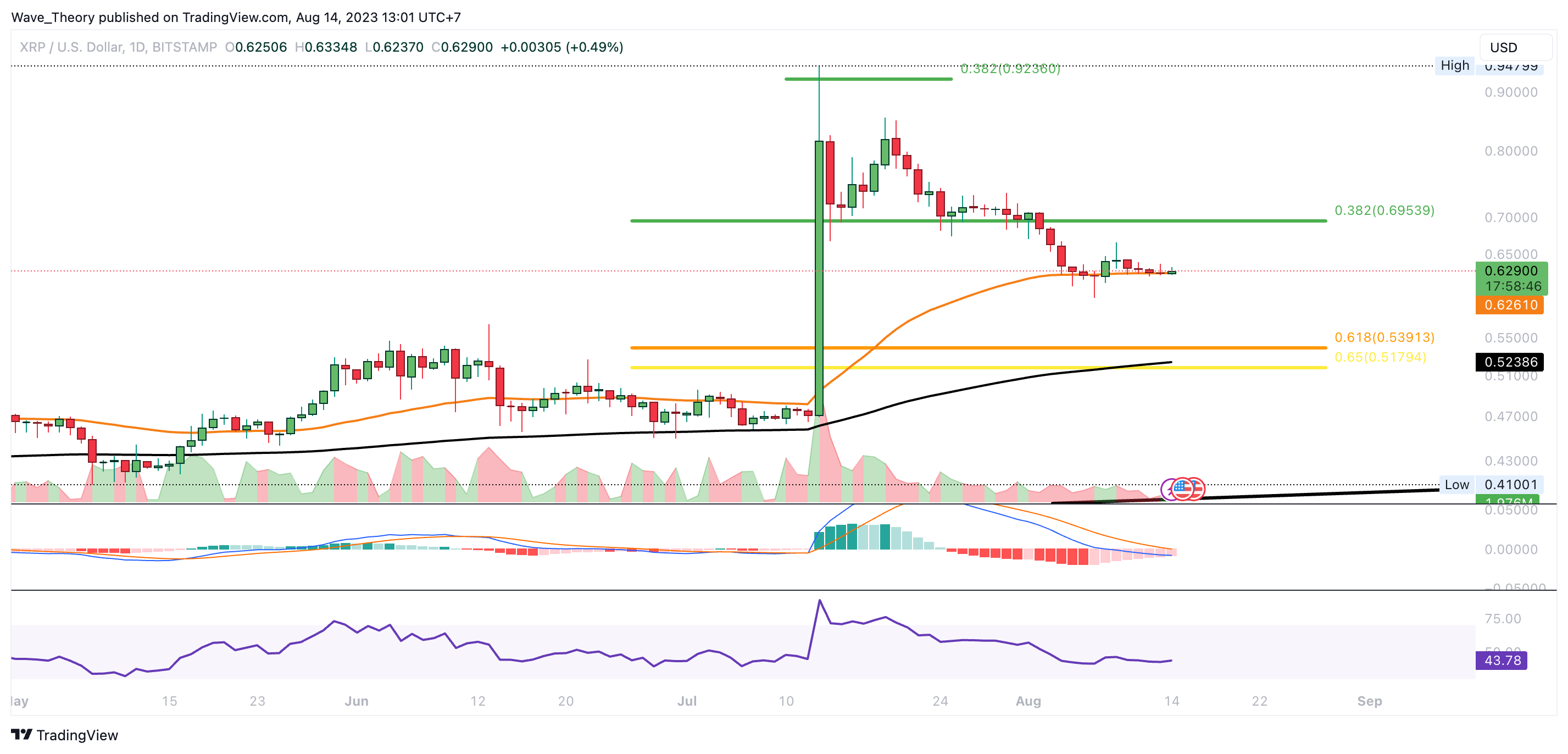 Wenn XRP diese bärisch bricht, könnte der Kurs zur Golden Ratio Unterstützung am 200-Tage-EMA bei rund 0,524 USD korrigieren. Dort angekommen, könnte der Kurs heftig nach oben abprallen.
