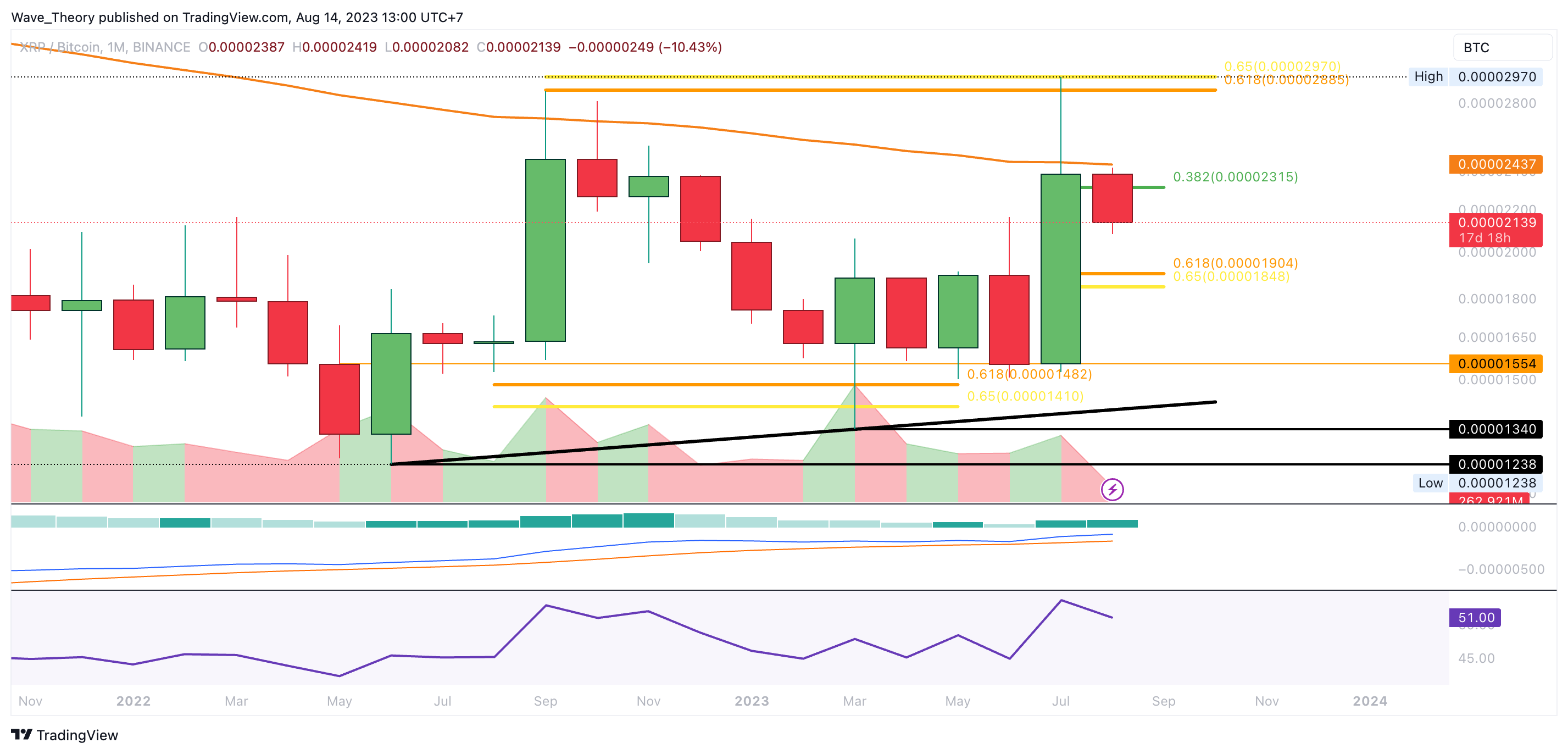 Gegen BTC konnte XRP letzten Monat nicht über dem 50-Monate-EMA Widerstand bei rund 0,00002437 BTC schließen. Seither befindet sich Ripple in einer Korrekturbewegung. Demnach könnte der Kurs jetzt zur Golden Ratio bei rund 0,000019 BTC zurückkehren, um daran bullisch abzuprallen.