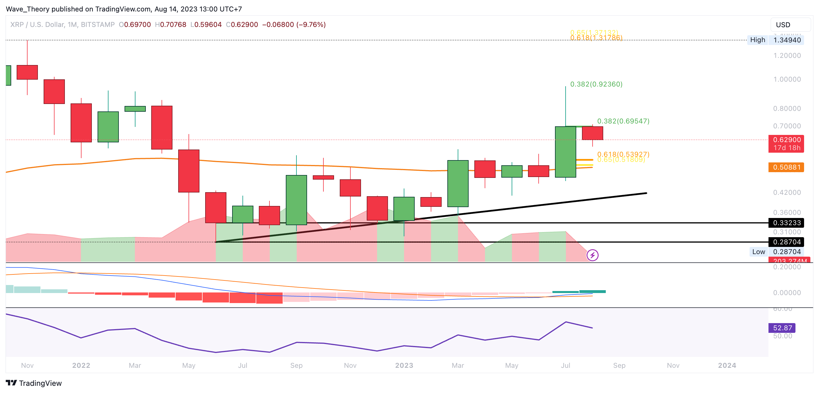 Im Monatschart konnte der Kurs letztem Monat nicht über dem 0,382 Fib Widerstand bei rund 0,694 USD schließen. Seither befindet Ripple in einer Abwärtsbewegung. XRP findet bei rund 0,51 USD die nächste signifikante Fib Unterstützung. Dort fungiert der 50-Monate-EMA als zusätzliche Unterstützung.
