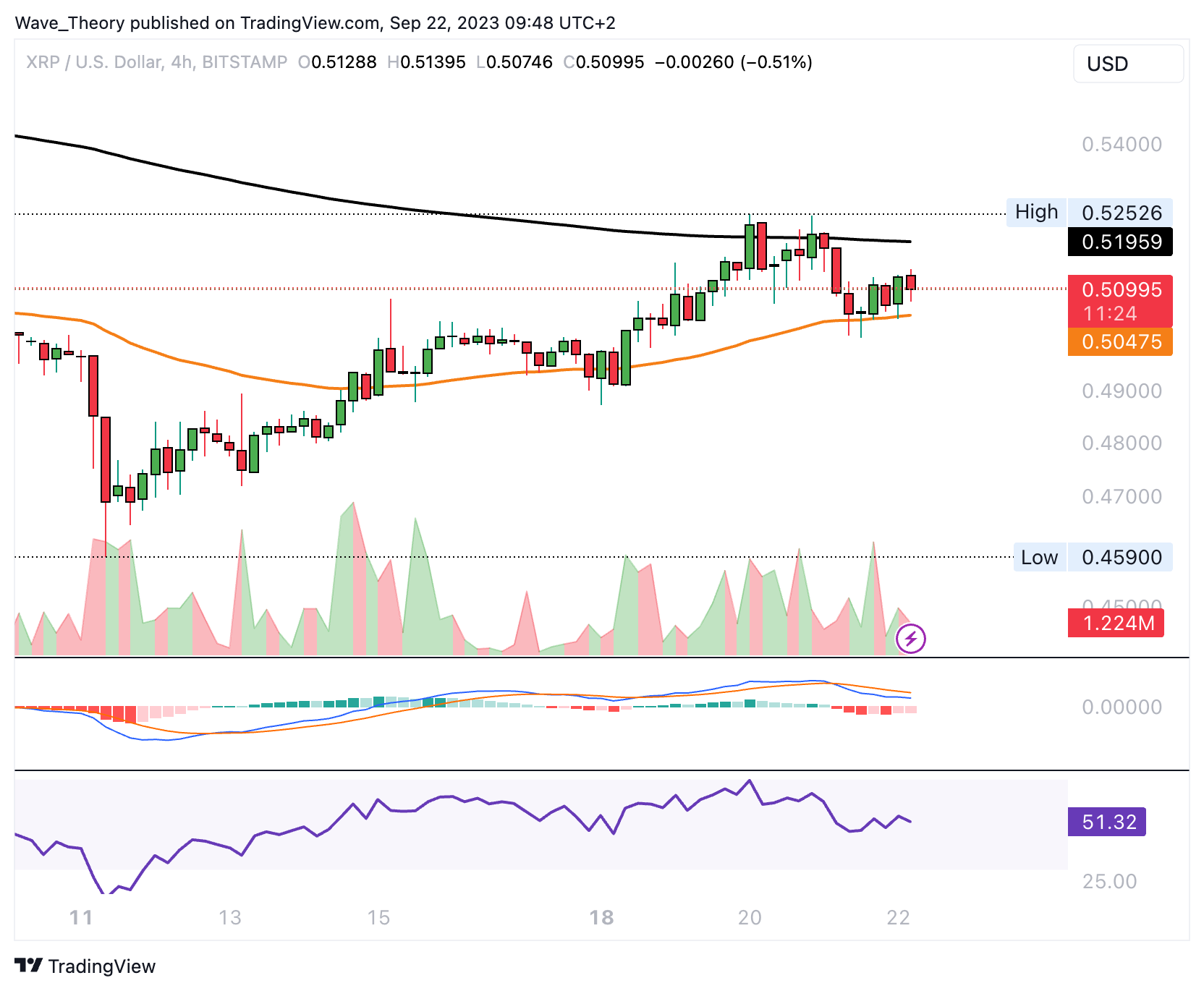 Im 4H-Chart liegt bereits ein Death Cross vor, womit der Trend kurzfristig bereits bärisch bestätigt ist. Zudem sind die MACD Linien bärisch überkreuzt. Das Histogramm des MACDs tickt hingegen bullisch höher und der RSI gibt weder bullische noch bärische Signale. Derzeit stößt Ripple am 50-4H-EMA bei rund 0,505 USD auf signifikante Unterstützung.