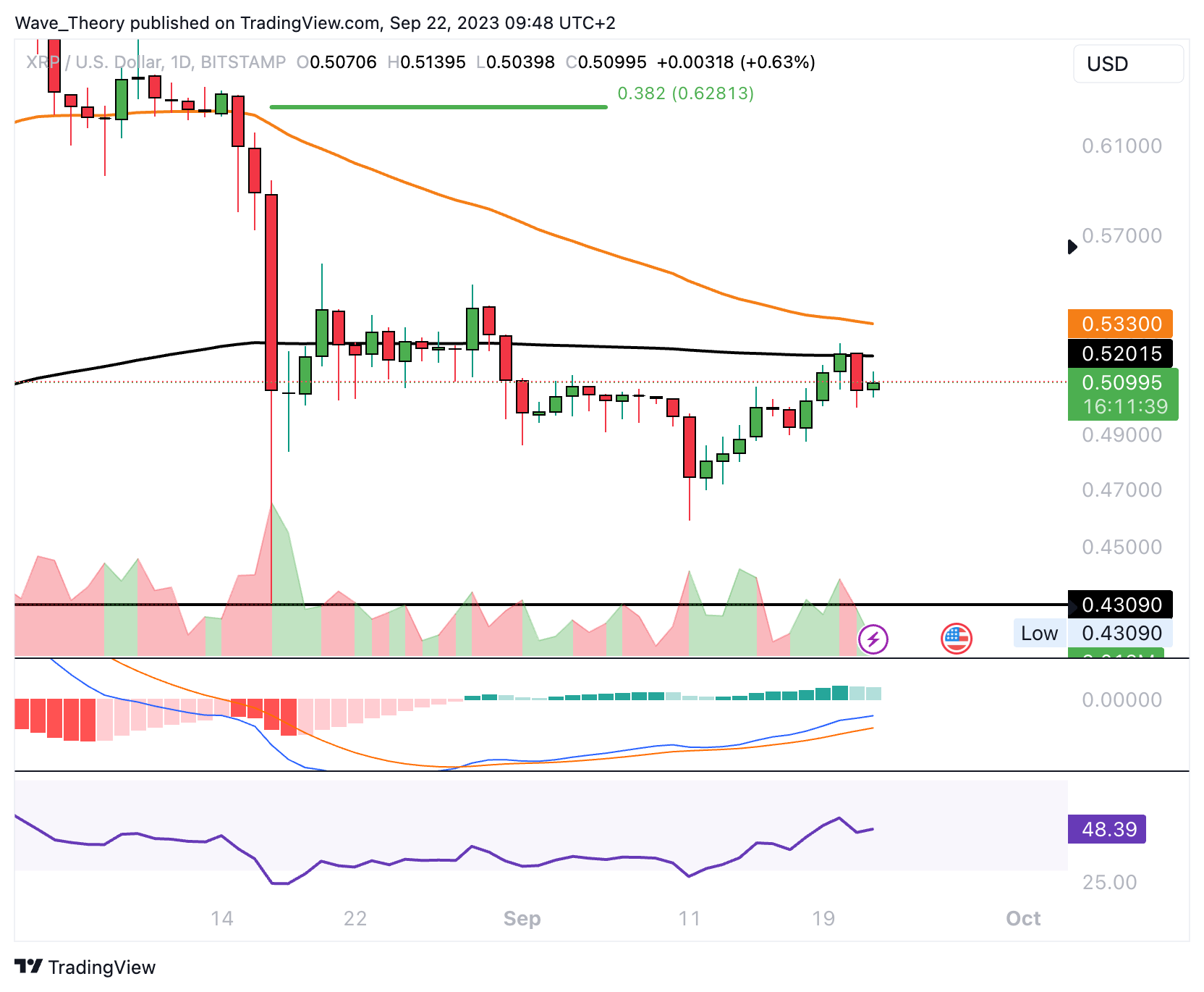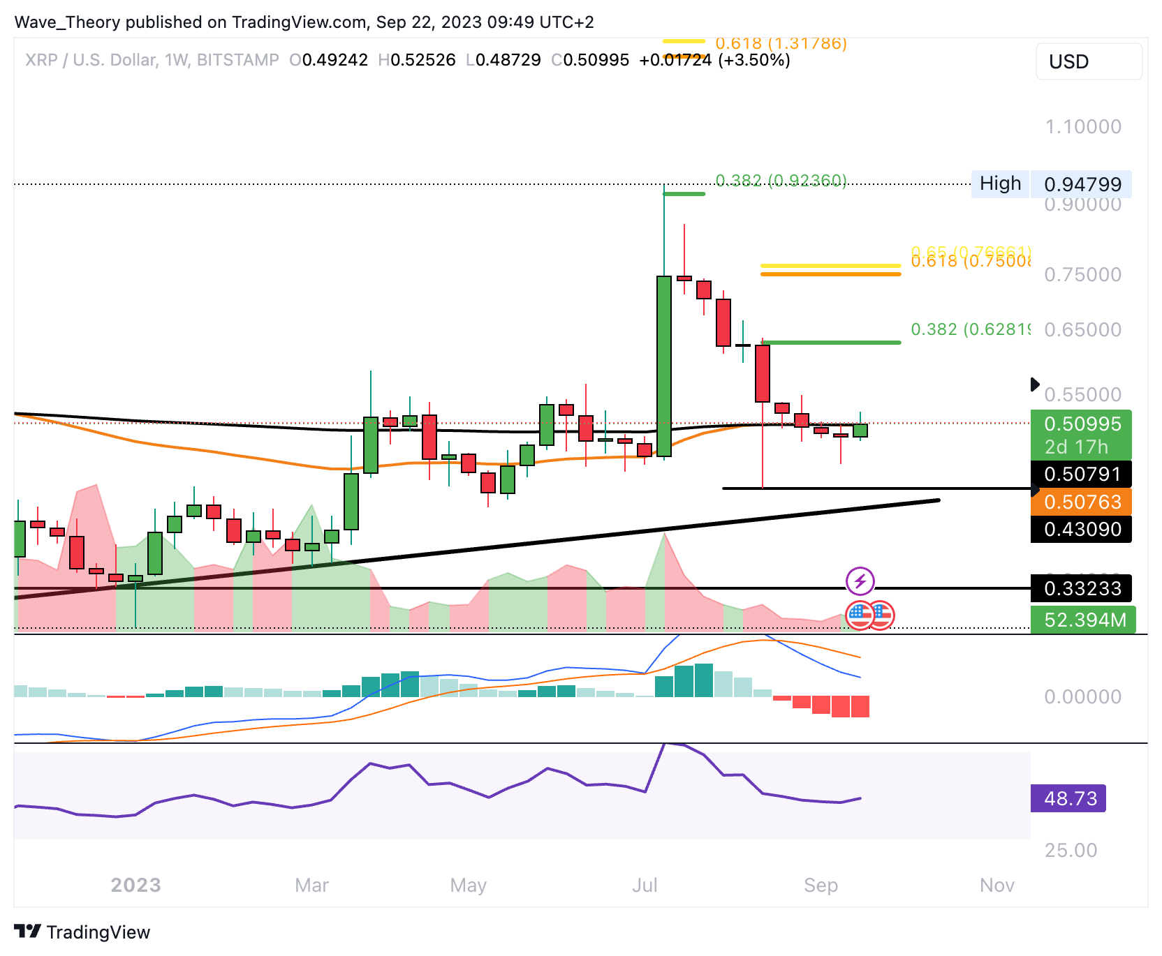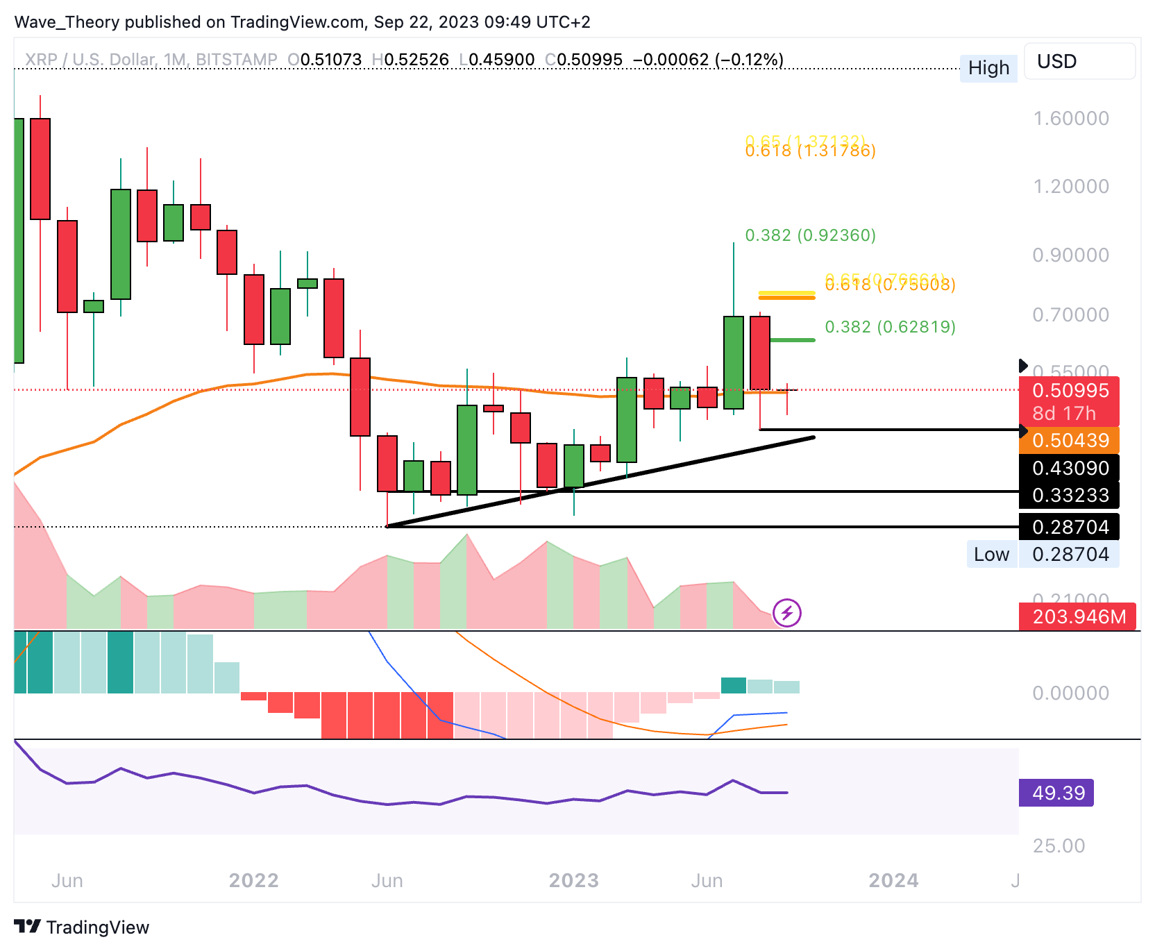 Wenn die 50-Monate-EMA Unterstützung bei rund 0,5044 USD nicht halten kann, findet XRP am letzten Tiefpunkt bei rund 0,43 USD die nächste signifikante Unterstützung.