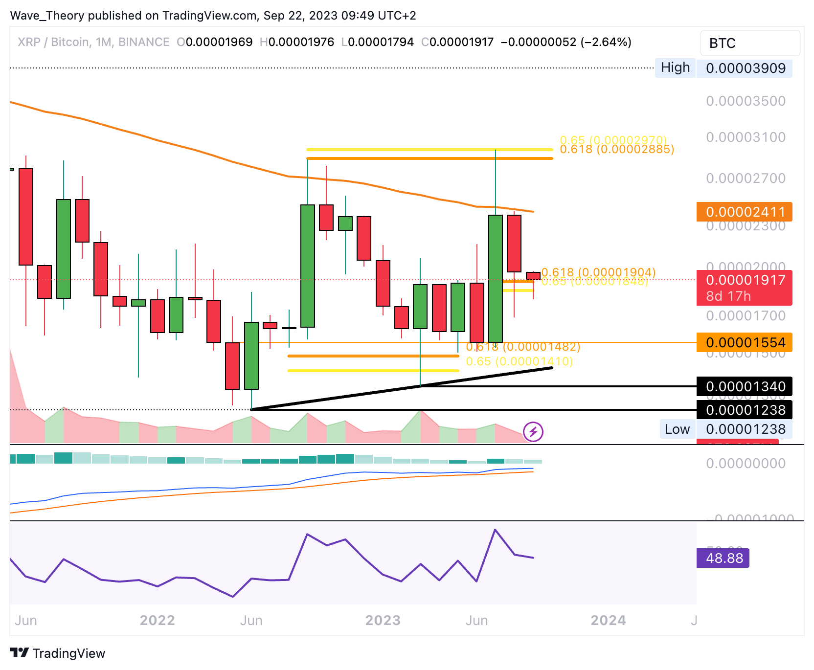 Gegen BTC konnte sich der XRP Kurs wieder über die Golden Ratio Unterstützung bei rund 0,000019 BTC kämpfen