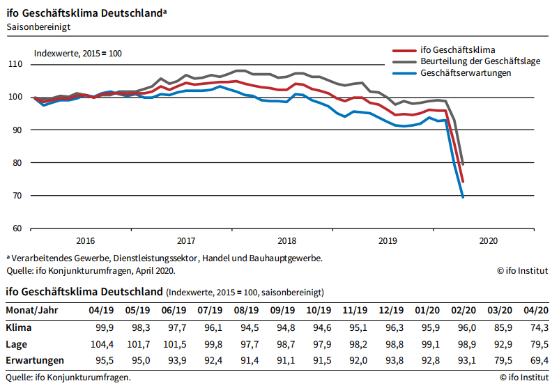 Da die Unternehmen ihre Geschäfte bereits für längere Zeit einstellen mussten, hat das nachweislich verheerende Folgen für die deutsche Wirtschaft. Am 24. April 2020 wurde berichtet, dass der deutsche IFO-Index auf einen der niedrigsten Werte aller Zeiten gesunken ist. Das IFO-Institut ist ein Think Tank mit Sitz in München. Der Wert wird ermittelt, indem die Stimmung von 9.000 deutschen Unternehmen gemessen wird. Der Index wird häufig als Indikator für das Geschäftsklima in Deutschland verwendet.