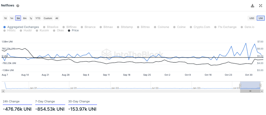 Ein sehr bullisches Zeichen ist dabei der deutliche Überschuss an UNI Abhebungen von Börsen. Denn in den letzten 24 Stunden wurden fast 500.000 mehr UNI Token abgehoben als auf Börsen eingezahlt.