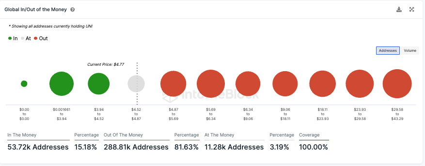 Derzeit befinden sich rund 81,6 % der UNI Adressen im Minus. Lediglich knapp 15 % könnten einen Gewinn erzielen, wenn sie ihre UNI Token zum aktuellen Marktpreis verkaufen würden.