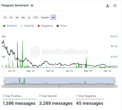 Auf Telegram ist die Stimmung gegenüber Uniswap größtenteils positiv. So wurden in den letzten sieben Tagen fast 1.400 positive Nachrichten zu UNI gezählt, aber lediglich 45 negative Nachrichten.