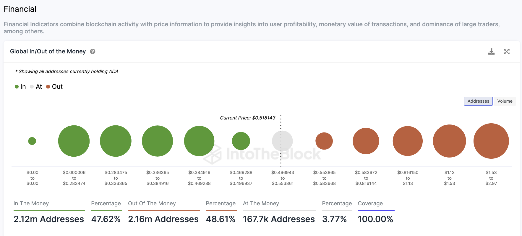 Laut IntoTheBlock, einem dienlichen Krypto-Tool, ist die Mehrheit der Cardano Adressen wieder im Minus. So schreiben rund 48,6 % der Adressen rote Zahlen.