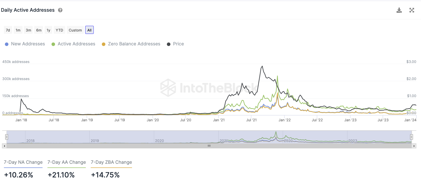 Im gleichen Zeitraum ist die Anzahl an aktiven Adressen sogar um rund 21 % angestiegen, während die Anzahl an Cardano Adressen ohne ADA Guthaben um fast 15 % gestiegen ist.