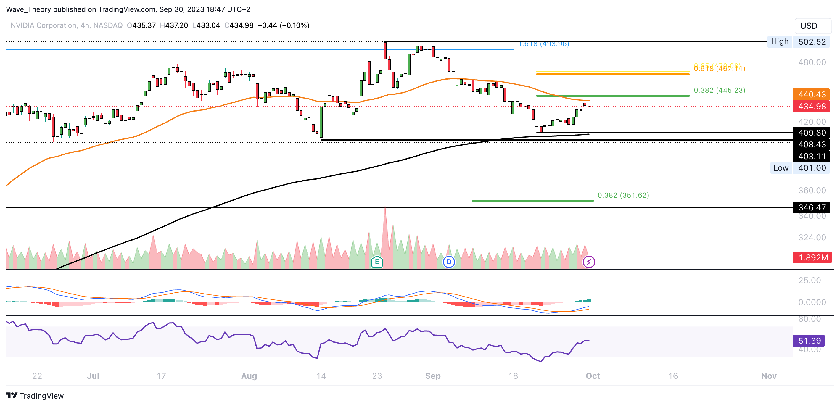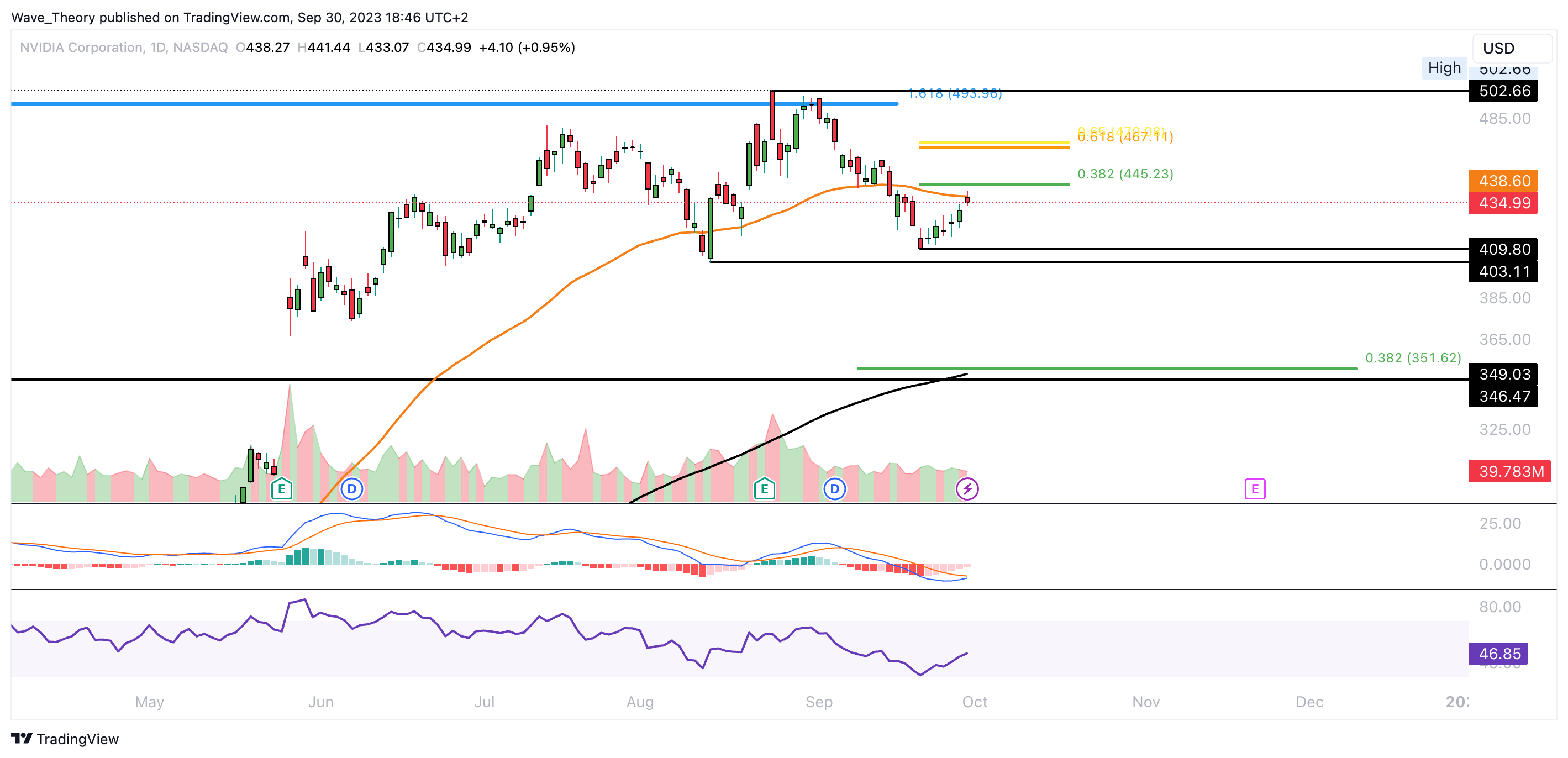 Die Nvidia Aktie scheint am 50-Tage-EMA Widerstand bei rund 438,6 USD bärisch abgewiesen zu werden. Wie tief wird der NVDA Kurs fallen?