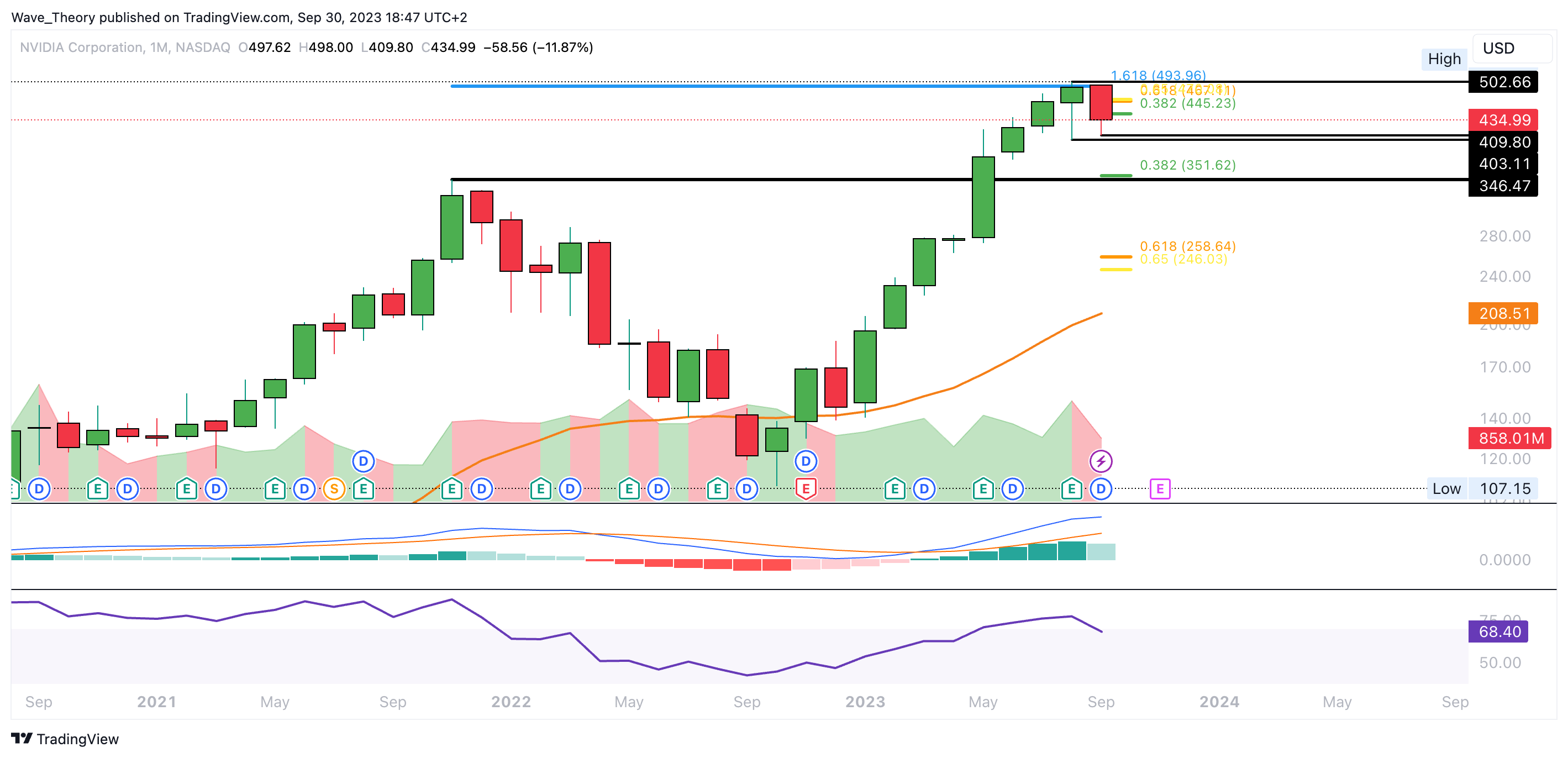 Der Monat verlief hingegen eindeutig bärisch für den Nvidia Kurs. Denn der Kurs ist von rund 503 USD auf rund 403 USD gefallen. Damit tickt nun auch das Histogramm des MACDs zum ersten Mal in elf Monaten bärisch tiefer. Die MACD Linien sind dabei aber noch bullisch überkreuzt und der RSI bewegt sich in neutralem Gebiet.
