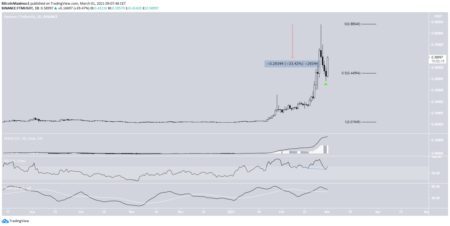 Anschließend gab es einen heftigen Drop. Danach hat sich der FTM Preis am 28. Februar 2021 über dem 0.5-Fib-Retracement-Level bei 0.45 USD eingependelt. Heute, am 01. März 2021, ist der FTM Preis wieder deutlich gestiegen. Die heutige Tageskerze könnte also theorethisch die Form einer bullischen „engulfing Candlestick“ annehmen. Falls das passiert, dann wird der Kurs wahrscheinlich danach weiter anziehen.