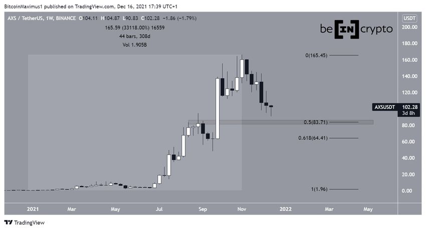 Anfang 2021 notierte AXS bei 0,50 US-Dollar. Der Token erlebte im Laufe des Jahres einen großen Aufschwung und erreichte am 4. November ein Allzeithoch von 166,09 US-Dollar. Dies entspricht einem Wertzuwachs von 33.118% gegenüber dem letzten Tiefststand. Obwohl der Token seither gefallen ist, gibt es knapp unter dem aktuellen Kurs von 83,7 US-Dollar bzw. 64,4 US-Dollar eine deutliche Unterstützung. In jedem dieser Bereiche könnte der anhaltende Abwärtstrend ein Ende finden.