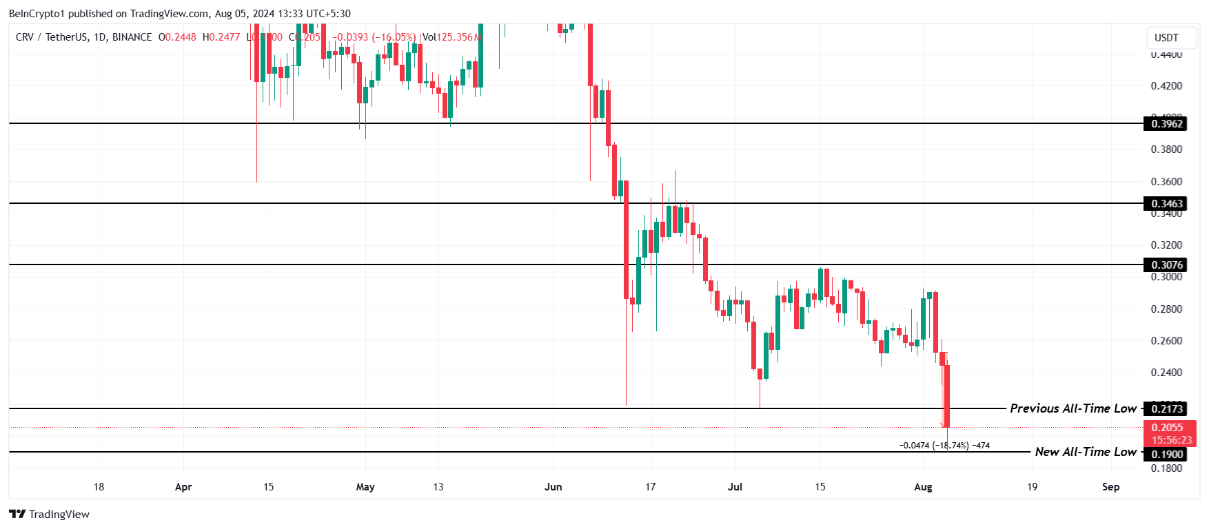 Jedoch erreichte CRV Anfang Juli ein neues Allzeittief bei 0,217 USD, das heute durchbrochen wurde. Das neue Allzeittief für den Curve DAO Token liegt jetzt bei 0,190 USD.