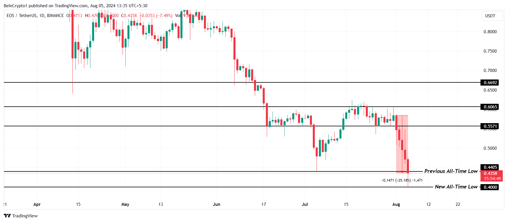 Obwohl der EOS-Kurs in den letzten Tagen keinen starken Rückgang verzeichnete, trug der anhaltende Rückgang der letzten Woche zum neuen ATL bei. In fünf Tagen fiel der Altcoin um 25 Prozent und handelt zum Zeitpunkt der Verfassung bei 0,43 USD.