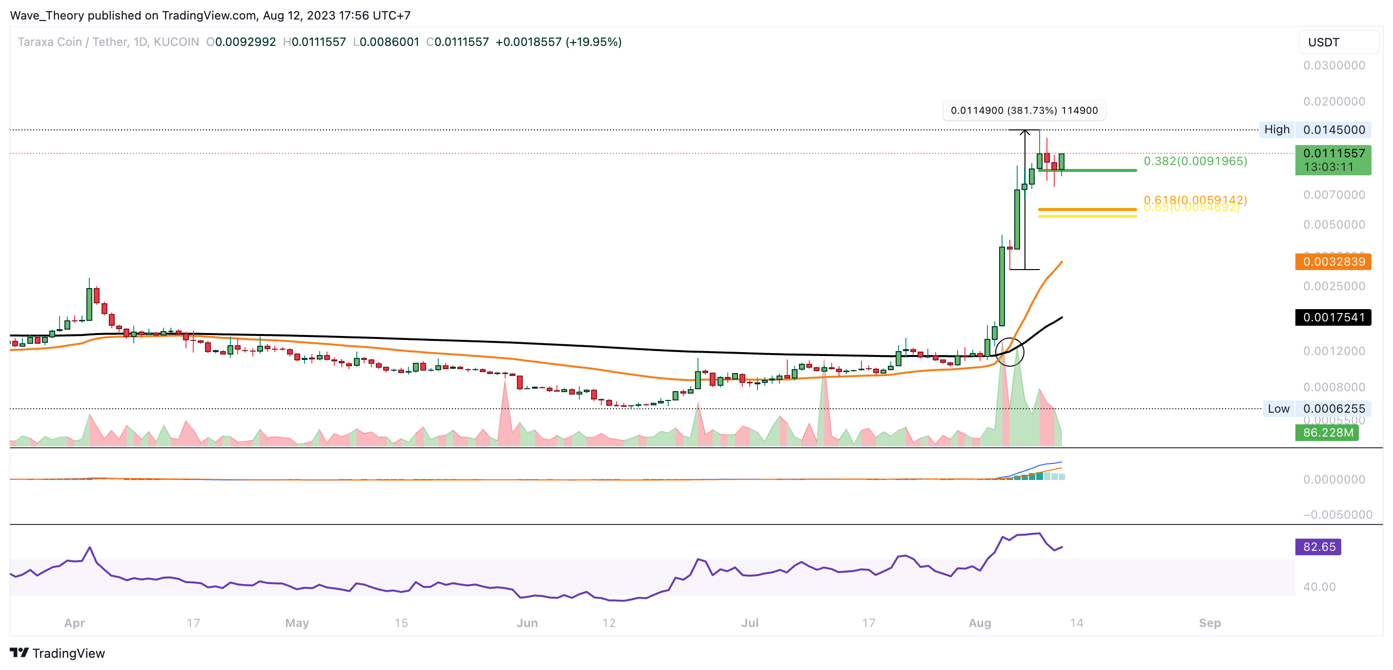 Die zweitstärksten Kursgewinne hat der Coin Taraxa (TARA) hingelegt. Denn dieser Coin ist seit letzter Woche um über 381 % im Kurs gestiegen. Auch der TARA Kurs hat dabei bereits eine Korrektur eingeleitet. Jedoch konnte der Kurs bereits an der 0,382 Fib Unterstützung bei rund 0,0091965 USD bullisch abprallen, womit der Kurs jetzt die Aufwärtsbewegung fortzusetzen scheint.