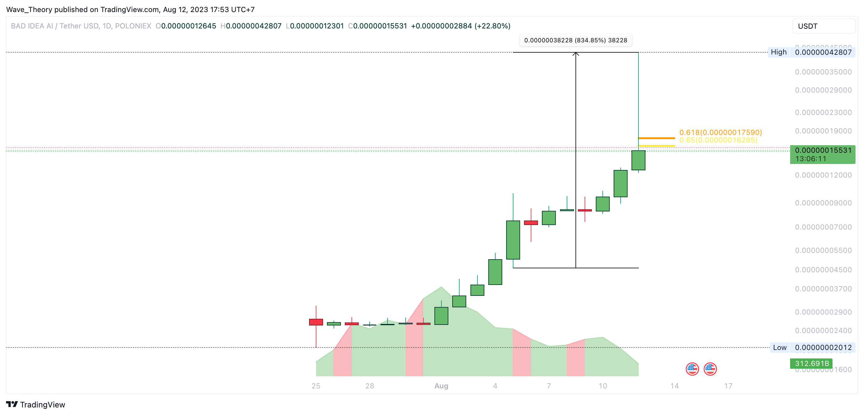Den ersten Platz für die beste Coin Kurs-Performance in dieser Woche belegt Bad Idea AI (BAD). Denn der BAD Kurs ist seit Samstag über 834 % im Kurs gestiegen. Seither ist der Kurs aber schon wieder sehr stark gefallen, womit sich der Kurs jetzt an der Golden Ratio Unterstützung bei rund 0,000000175 USD befindet.