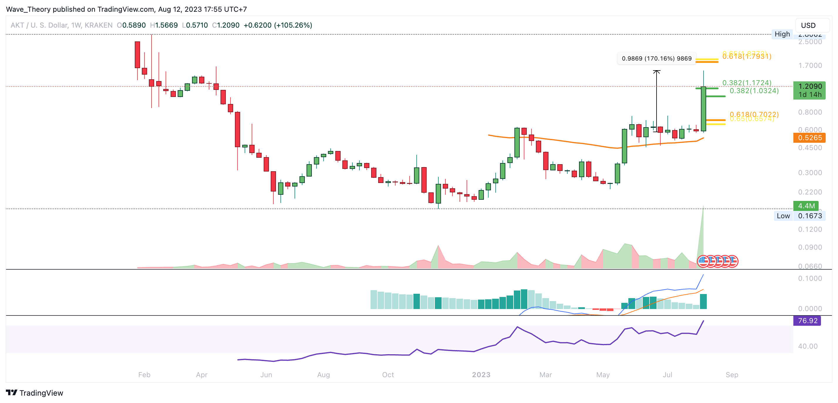 Davon abgesehen tickt das Histogramm des MACDs in dieser Woche wieder bullisch höher, nachdem es die letzten sechs Wochen bärisch tiefer getickt hatte. Zudem sind die MACD Linien bullisch überkreuzt. Der RSI erreicht hingegen stark überkaufte Regionen, woraufhin schon bald eine Korrektur folgen könnte. Sollte der AKT Kurs diese Woche über dem 0,382 Fib Niveau bei rund 1,1724 USD schließen, könnte der AKT Kurs den Golden Ratio Widerstand bei rund 1,8 USD anvisieren.