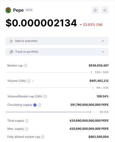 Trotz dieses gewaltigen Kursanstiegs liegt die Marktkapitalisierung von Pepe bei noch unter 1 Milliarde USD. Denn mit 836 Millionen USD ist die Marktkapitalisierung von dieser Kryptowährung noch verhältnismäßig gering.
