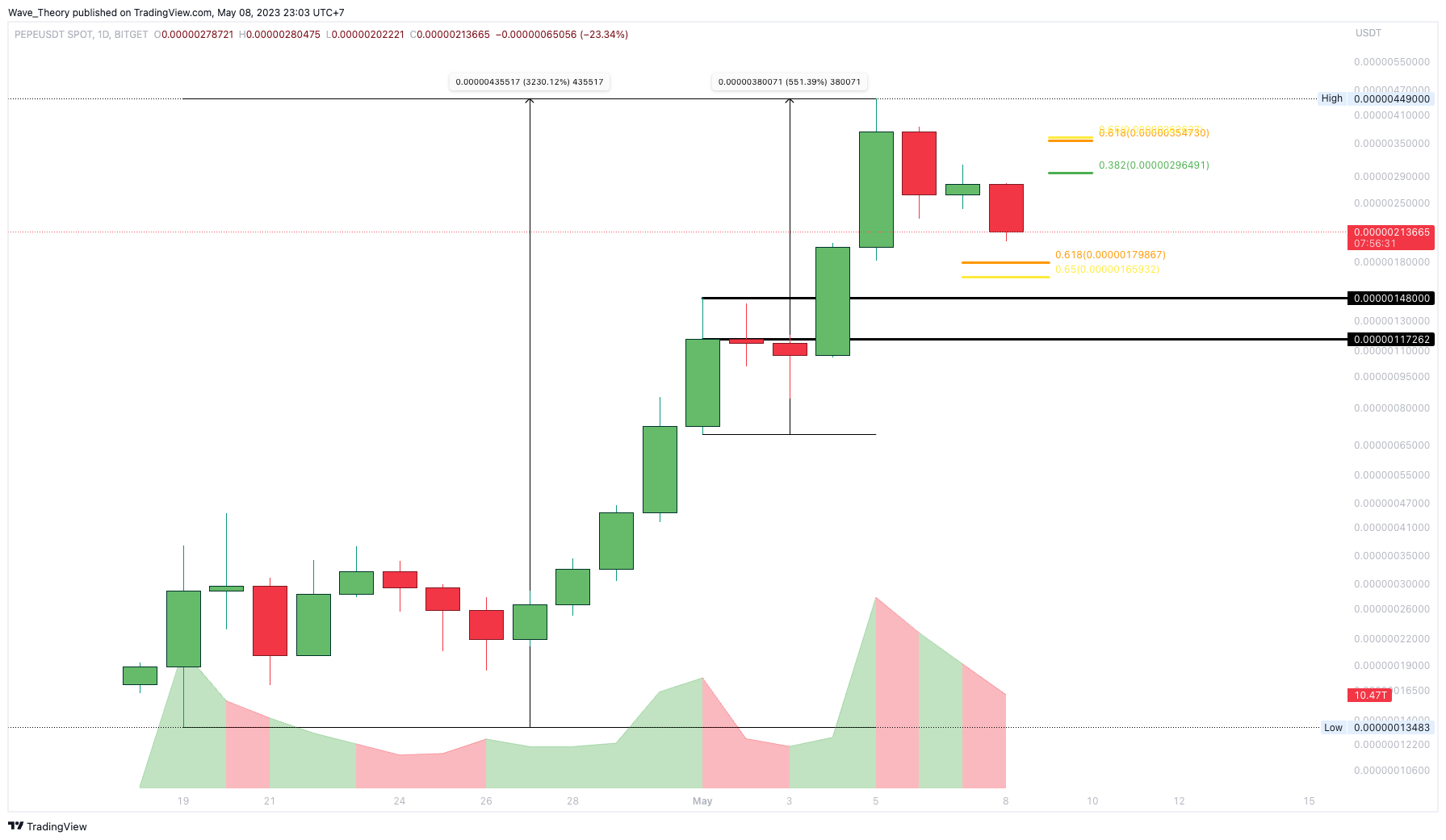 Das sind zwar Krypto-typische Kursanstiege, jedoch geschehen diese meistens in Bullenmärkten. Denn im Makrotrend befinden wir uns immer noch in einem Bärenmarkt. Nichtsdestoweniger hat PEPE bereits wieder einen Großteil des Kursanstiegs neutralisiert. Denn seit vorgestern befindet sich der Pepe Kurs in einer starken Korrekturbewegung.