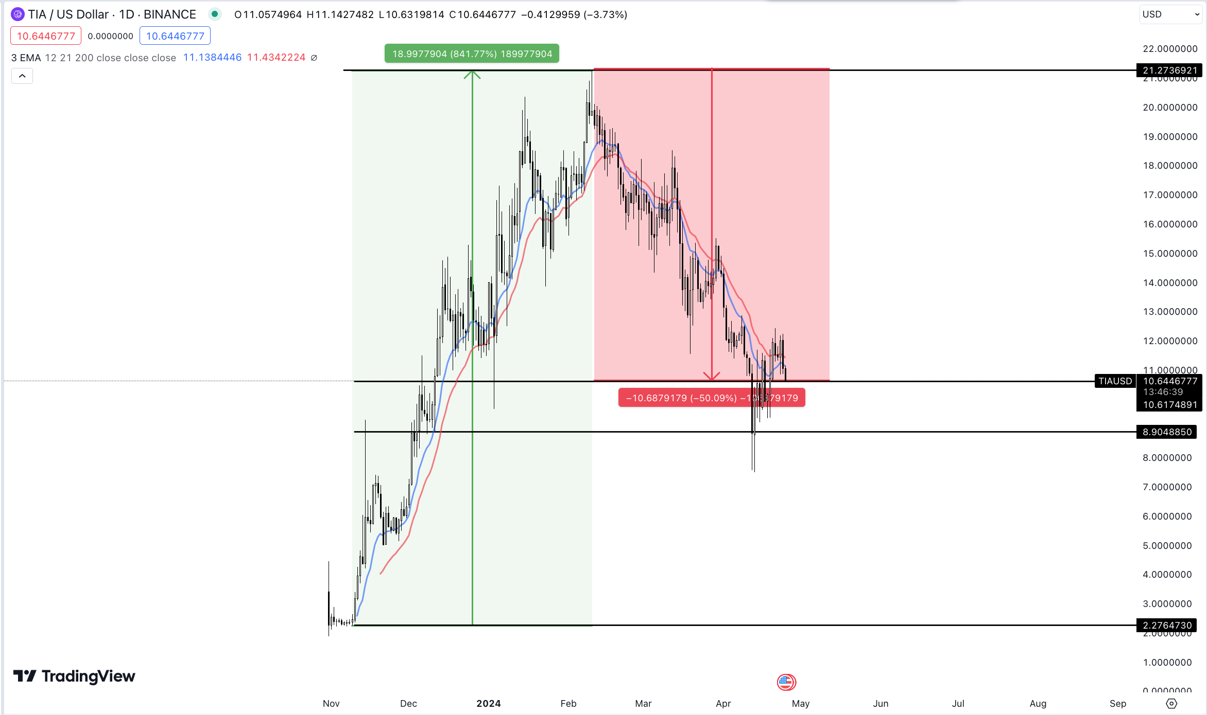 In der Community fand die native Kryptowährung TIA daher großen Anklang. Dennoch vermochte der TIA Kurs seinen Aufwärtstrend angesichts des jüngsten Abverkaufs nicht zu halten. Nachdem er seit November 2023 um über 840 Prozent von 2,27 USD auf 21,27 USD gestiegen war, stürzte er jüngst um über 50 Prozent auf aktuell 10,73 USD.