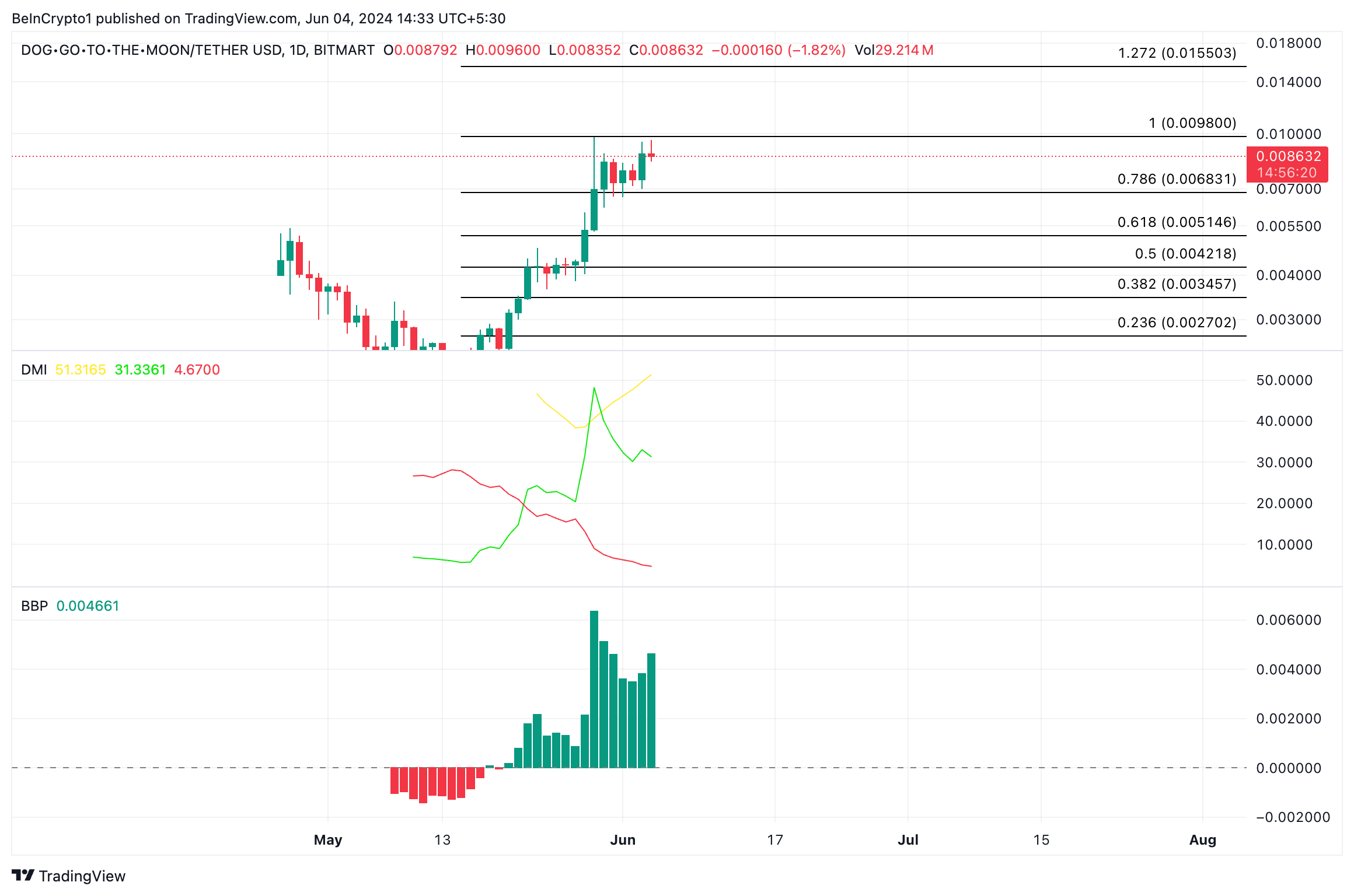 Trotz der leichten Gewinnmitnahmen hat der Preis des Memecoins in den letzten 24 Stunden um 20 Prozent zugenommen. Der positive Wert des Elder-Ray-Index von DOG deutete darauf hin, dass die Bullen weiterhin die Kontrolle haben.