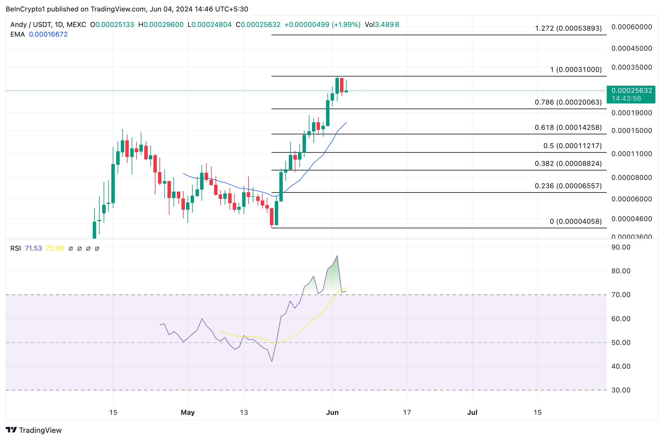 Der steigende RSI von ANDY bestätigt den Trend zur Akkumulation. Aktuell liegt der Wert des Indikators bei 71,39, was darauf hindeutet, dass der Kaufdruck die Token Verkäufe überstieg.