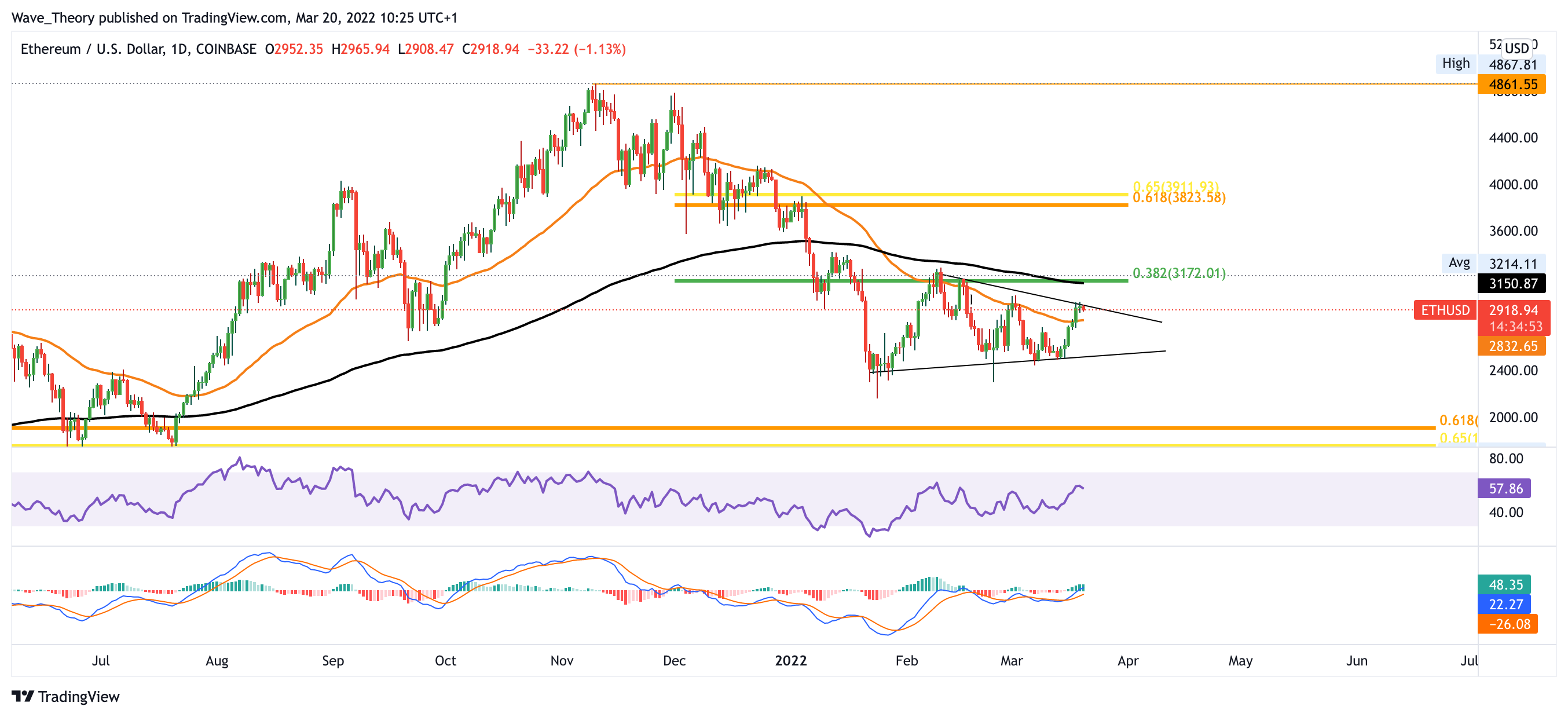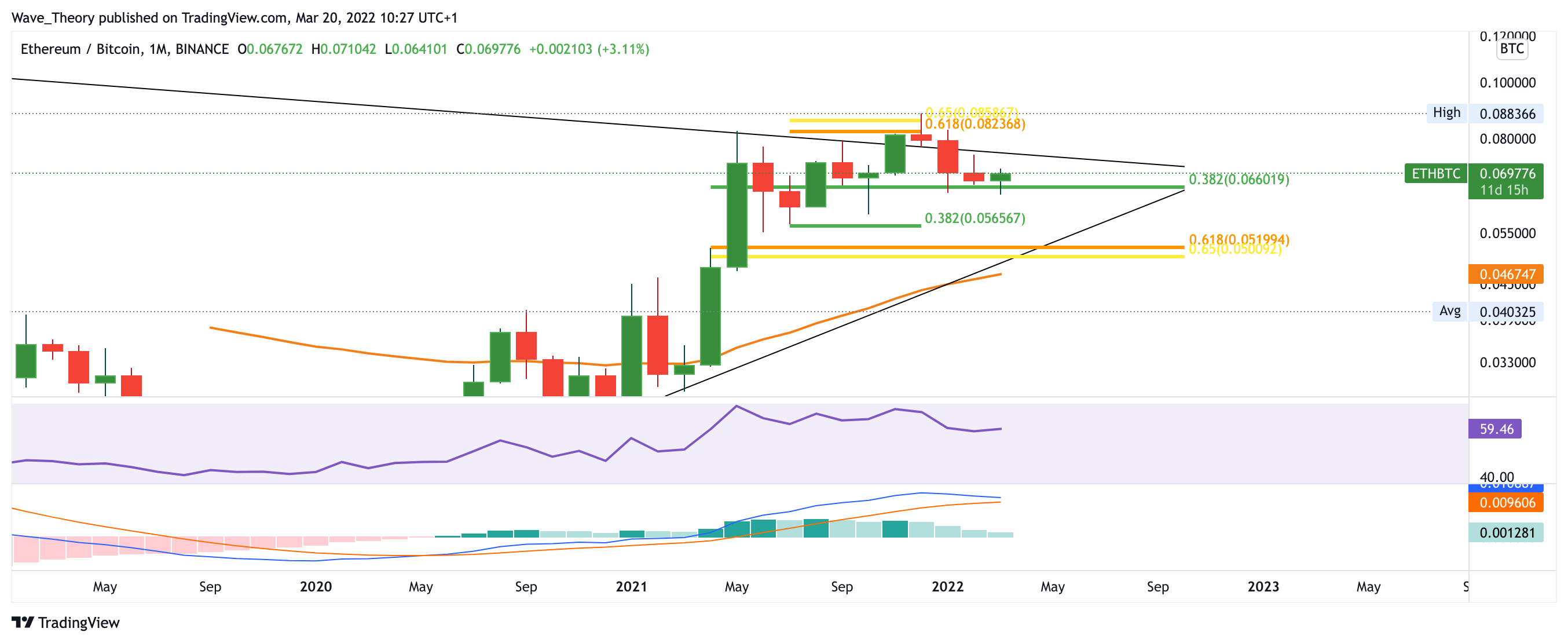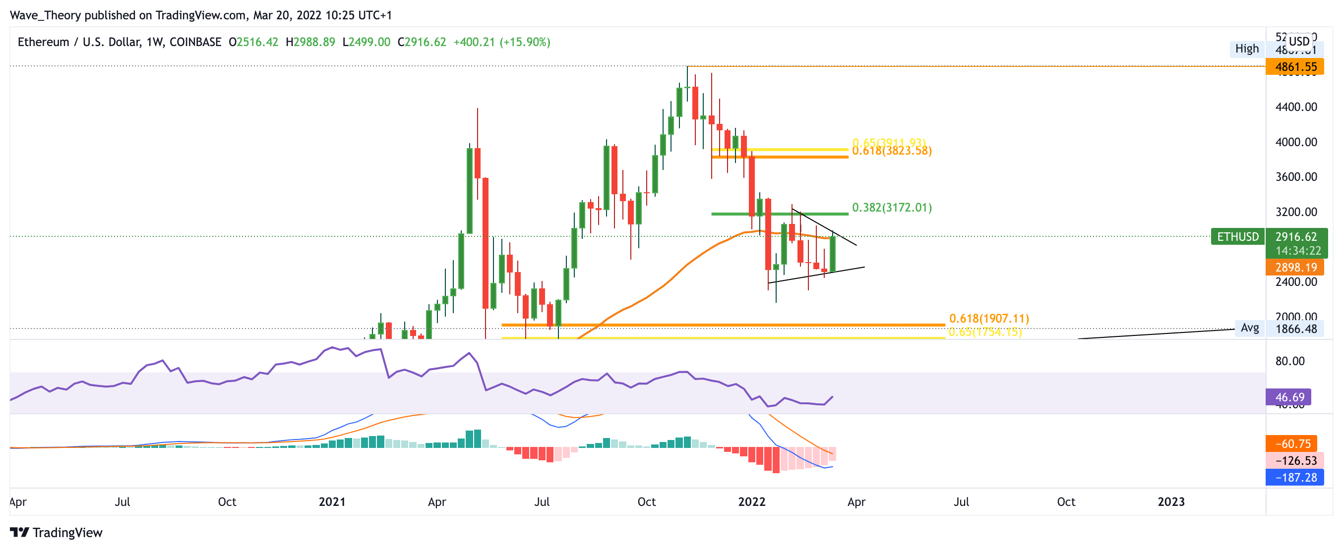 Im Monatschart fehlt es dem Ethereum Kurs noch wenige Preisbewegungen nach oben, damit der März bullisch statt bärisch für den ETH Kurs verläuft. Sollte Ethereum jedoch am 0,382 Fib Widerstand bei rund 3.200 USD abgewiesen werden, findet er spätestens bei rund 1.800 USD signifikante Unterstützung an der Golden Ratio. Etwas tiefer, zwischen 1.100 – 1.500 USD, wartet zudem historische Unterstützung auf den ETH Kurs. Dort eilt zusätzlich der 50-Monate-EMA zur Hilfe. Insgesamt zeigt sich der Monatschart aber noch immer bärisch: sowohl das Histogramm zeigt sich bärisch als auch die MACD Linien.